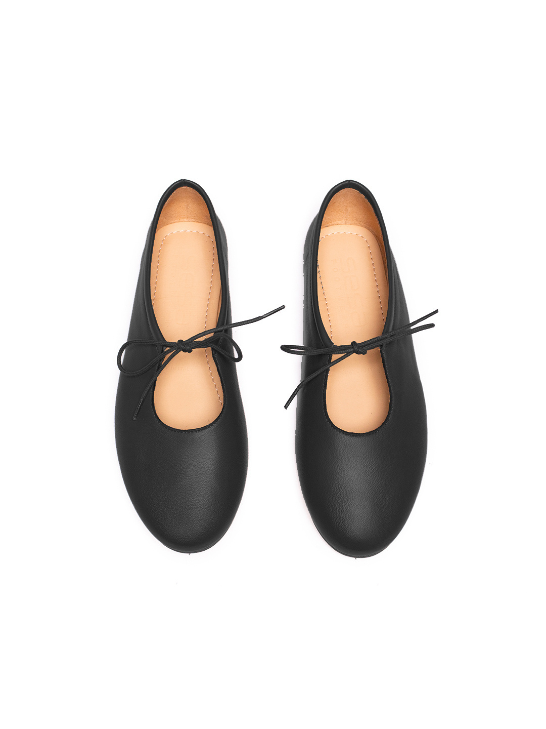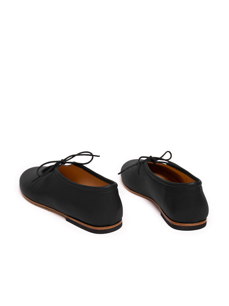Ballerines à lacets en nappa de mouton souple, avec une doublure en cuir de veau naturel. Dotées d’une semelle en cuir faite main pour une finition soignée. Conçues et fabriquées en Italie.