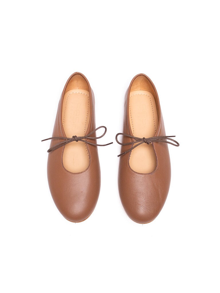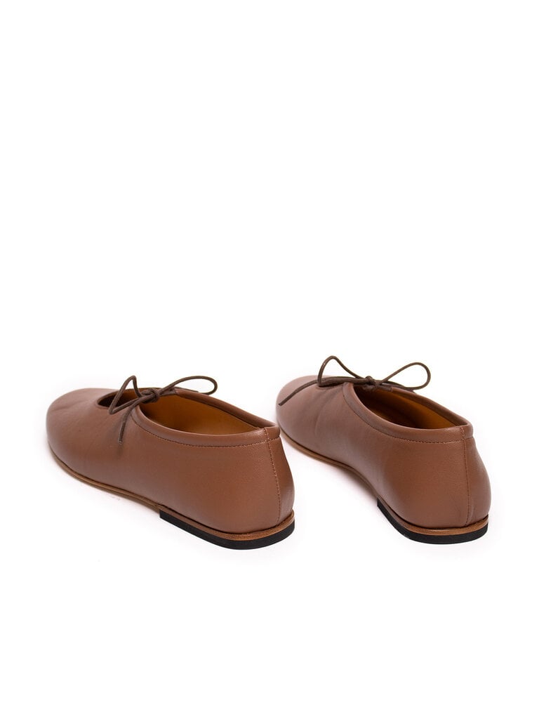 Ballerines à lacets en nappa de mouton souple, avec une doublure en cuir de veau naturel. Dotées d’une semelle en cuir faite main pour une finition soignée. Conçues et fabriquées en Italie.