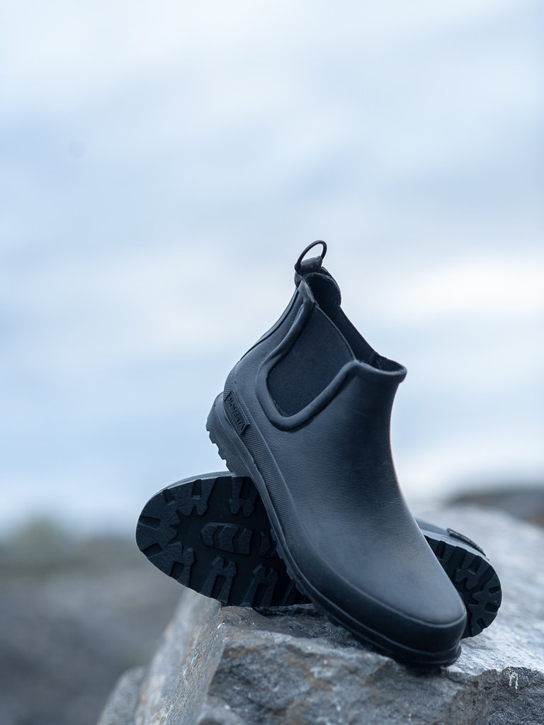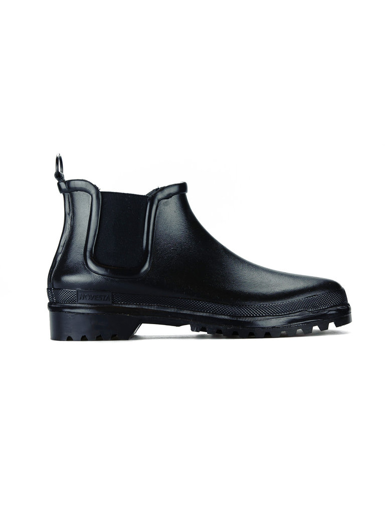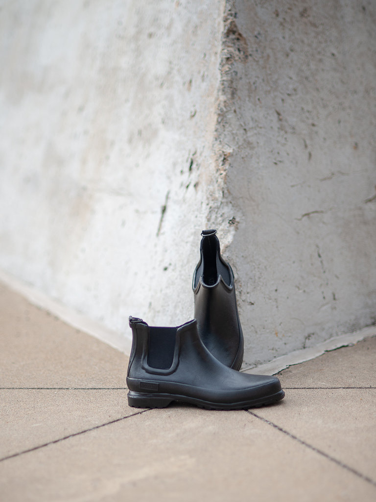Un modèle basé sur la silhouette intemporelle de la botte Chelsea. Ici, dans une version classique, tout en noir. Fabriqué à la main à partir de caoutchouc naturel, ces bottes sont douces et flexibles et s’adaptent aux pieds du porteur avec le temps.