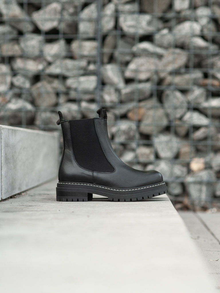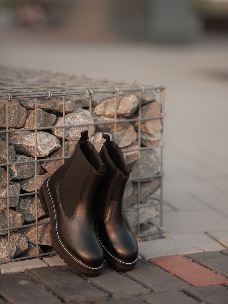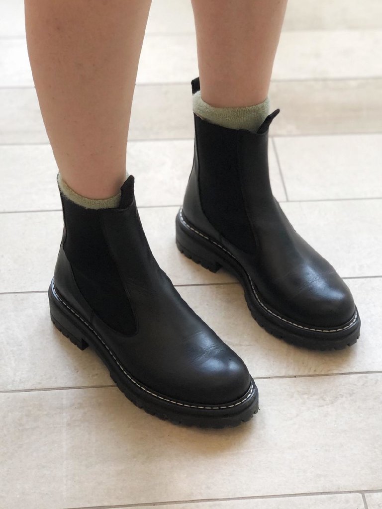 Bottes Chelsea en cuir légères et confortables. La doublure et la semelle intérieure sont rembourrées en cuir. Bout rond et petit talon de 1,75"(4,45 cm). Languettes à tirer à l'arrière pour mieux les enfiler. Couture blanche distinctive à la base de la semelle. Tailles standards, choisissez votre pointure.