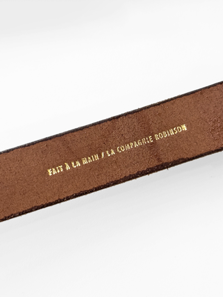 Ceinture d'un pouce en cuir au tannage végétal responsable. Mesurer votre tour de taille en pouces. Ceci correspond à la taille à choisir. Si vous obtenez un chiffre impair, choisir la taille au-dessus. Exemple tour de taille 27", choisir une ceinture 28"