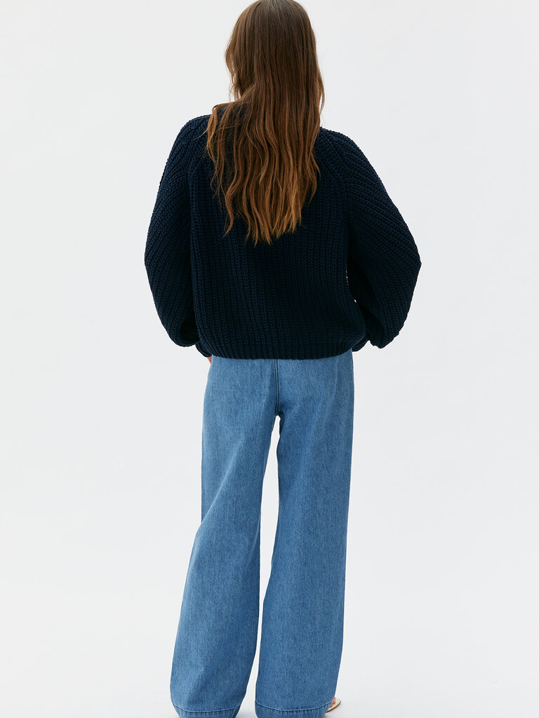 Chandail épais réalisé en fil de coton biologique portugais à haute torsion certifié GOTS. Ce tissu respectueux de l'environnement est doux et durable. Structure en demi-cardigan avec des manches en forme de selle à la mode. Côtes 2x2.