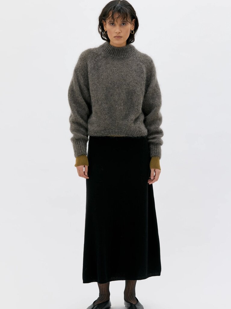 Pull volumineux confectionné dans un mélange italien de soie et de mohair. Coupe courte mais ample avec manches ballon, col montant et épaules tombantes. La matière lui confèrent une allure sculpturale tout en restant extrêmement léger et chaud.
