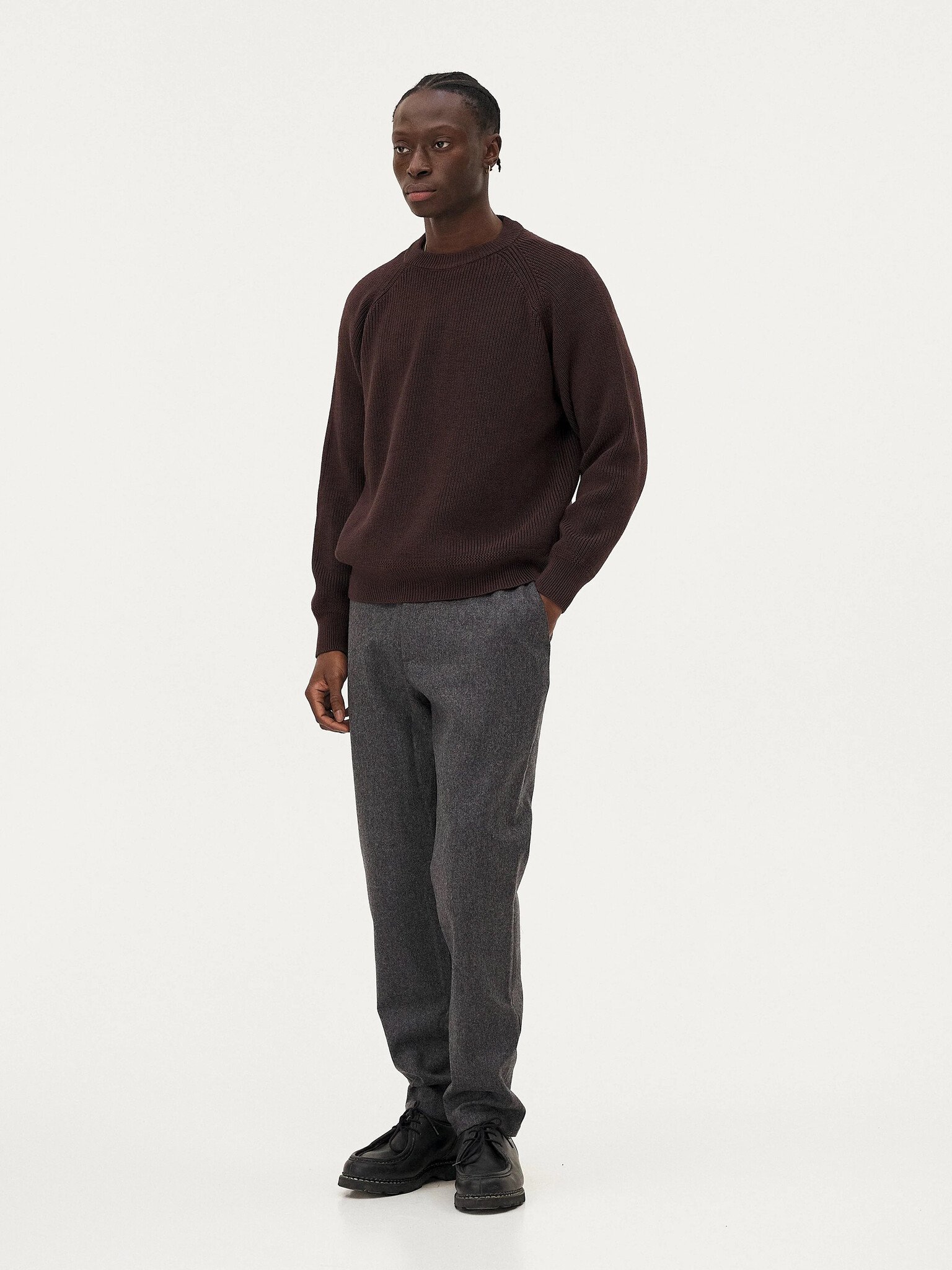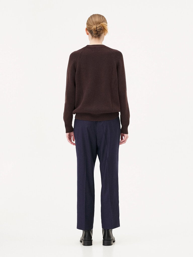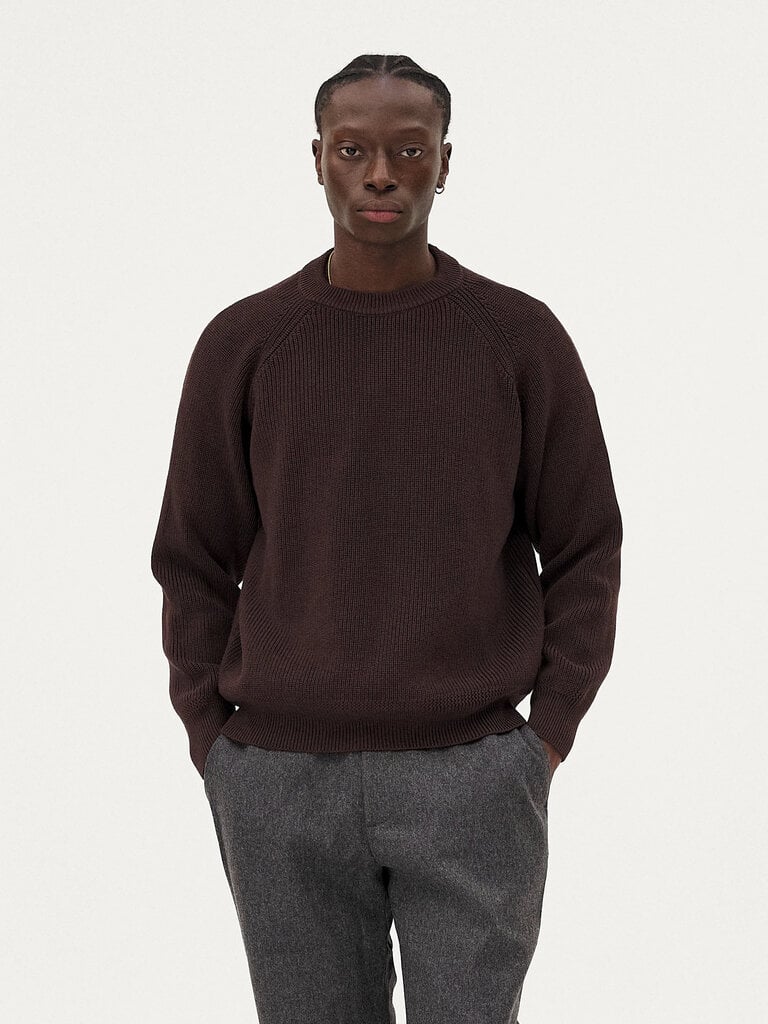 Le pull Oslo est tricoté dans une maille en laine mérinos et coton biologique certifié et RWS dense, lourde et texturée. Il est construit avec une manche raglan et un col rond ainsi qu'avec un délicat détail en zigzag au niveau des finitions côtelés.