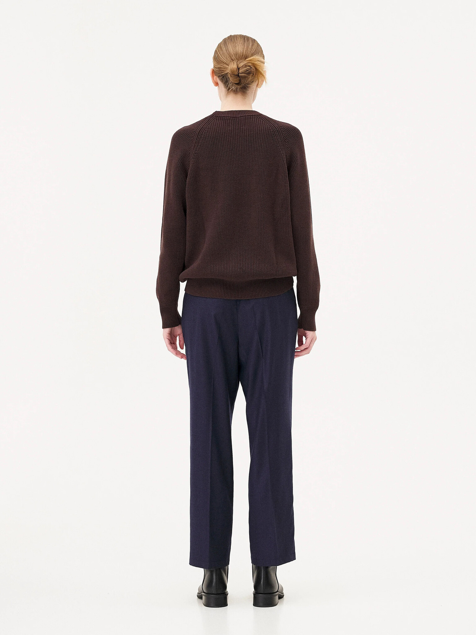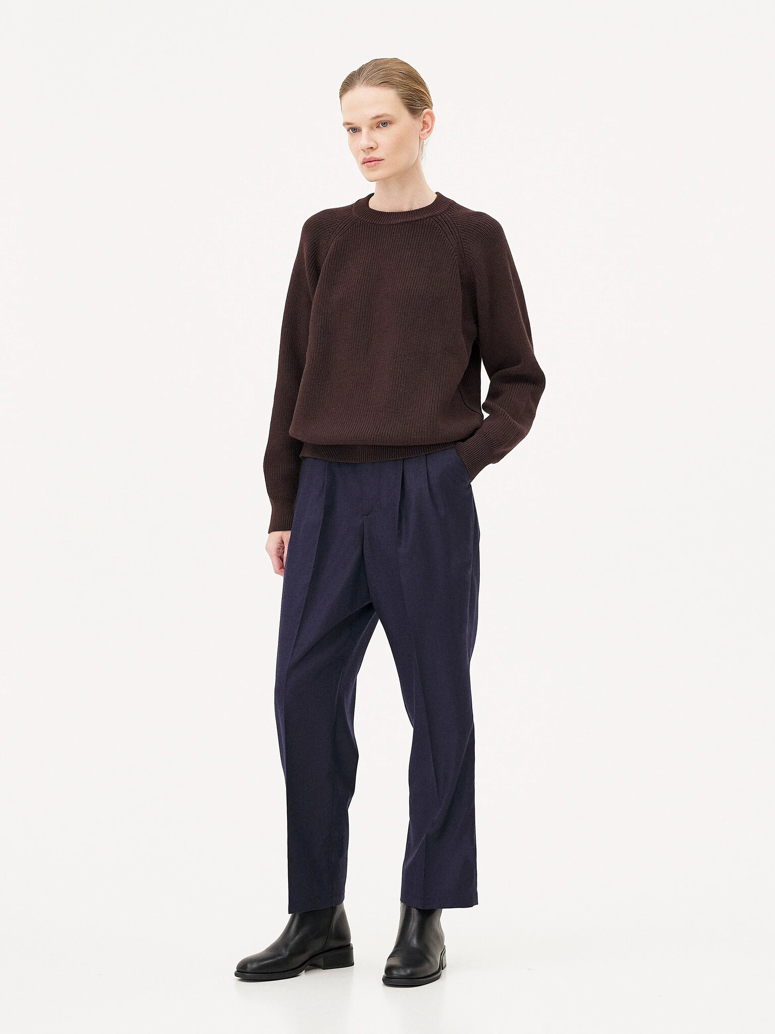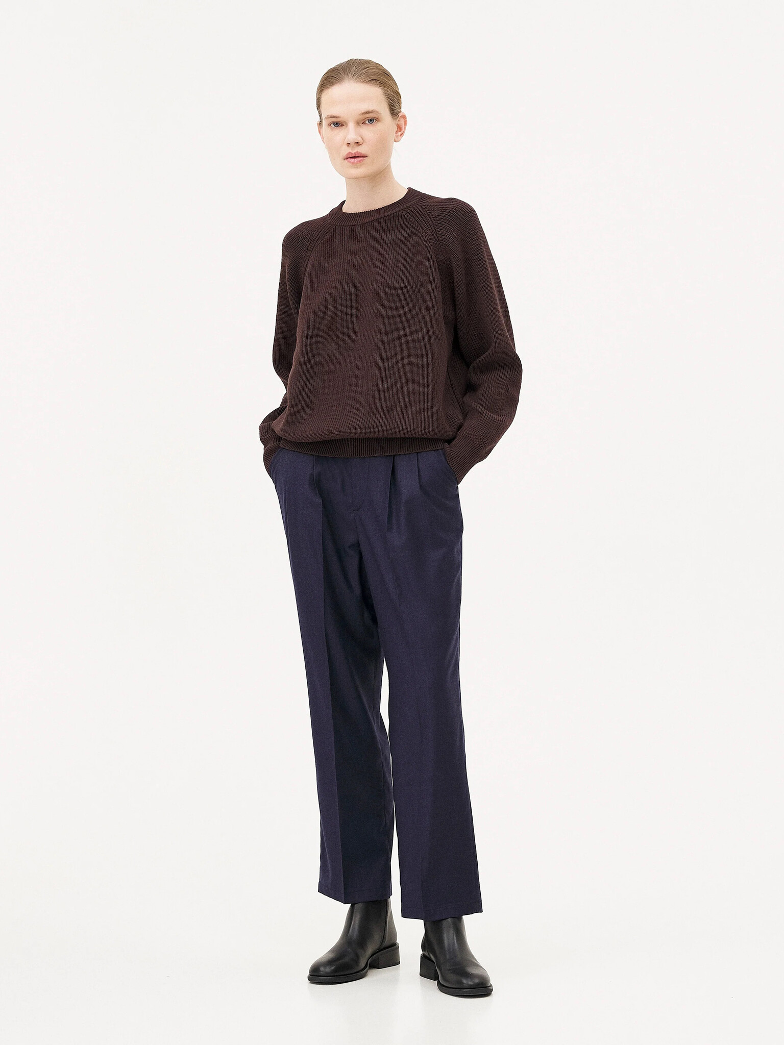 Le pull Oslo est tricoté dans une maille en laine mérinos et coton biologique certifié et RWS dense, lourde et texturée. Il est construit avec une manche raglan et un col rond ainsi qu'avec un délicat détail en zigzag au niveau des finitions côtelés.