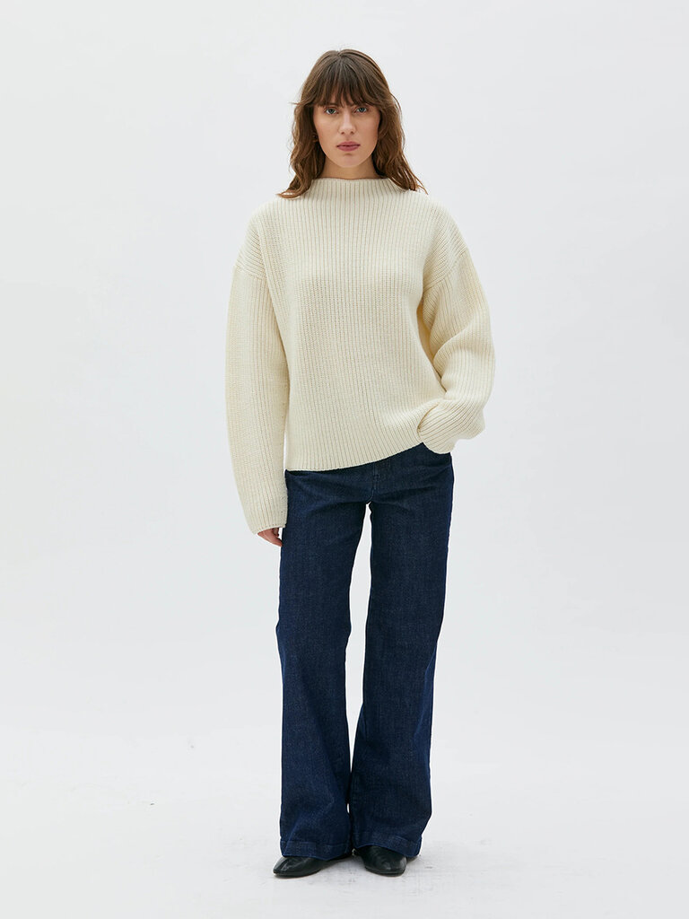 Ce chandail à col montant présente une maille côtelée épaisse et structurée, avec une coupe ample et décontractée ainsi que des épaules tombantes. Confectionné à partir d’un fil non traité, il allie confort et durabilité.