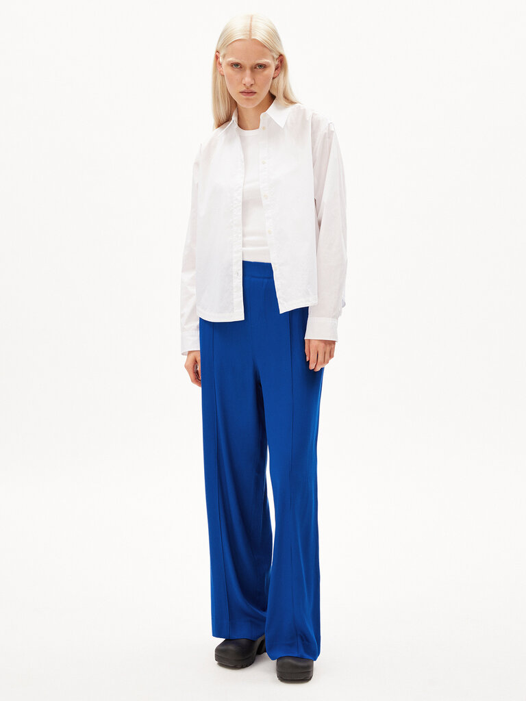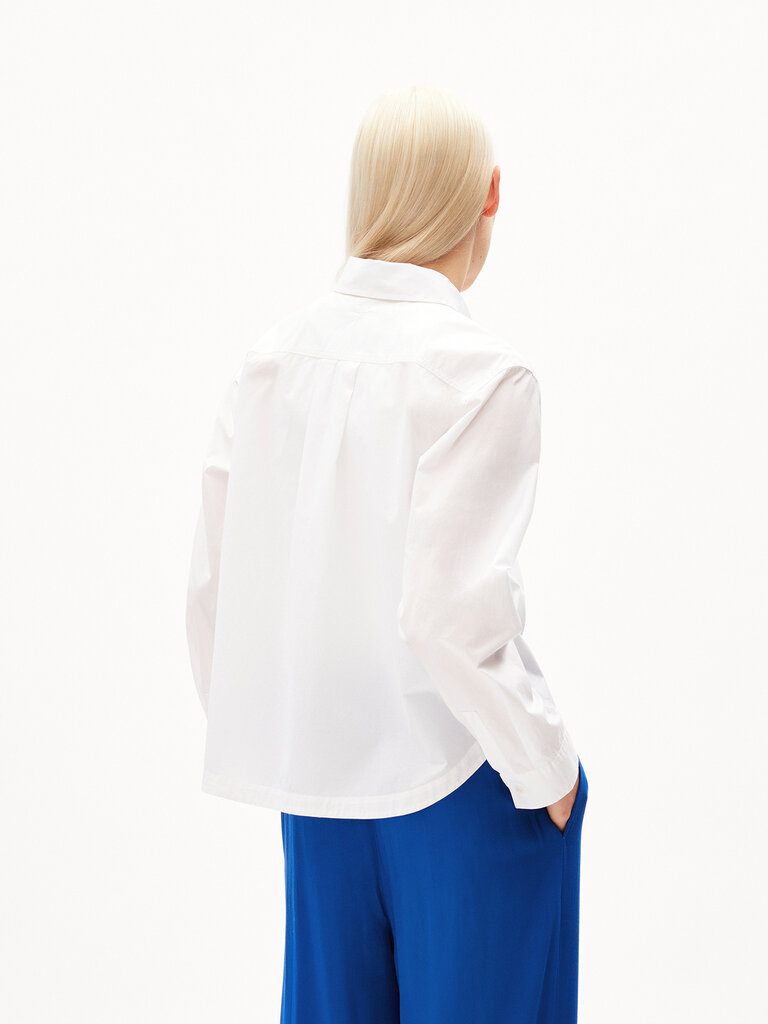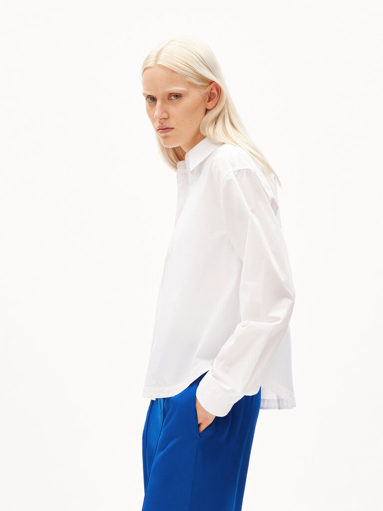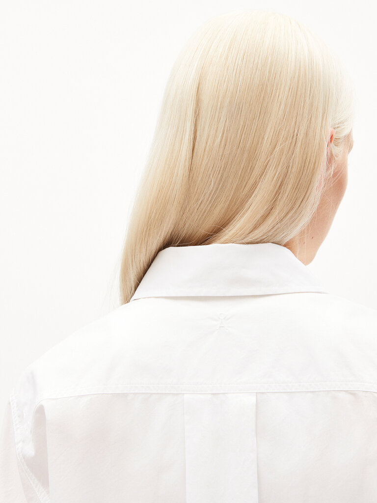 Chemisier à manches longues avec une coupe décontractée. Longueur standard. Fabriqué dans un tissu de coton biologique. Ine mesure 179 cm et porte la taille S.