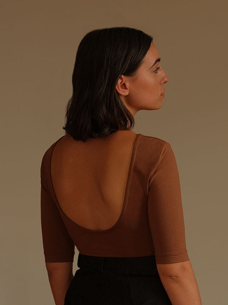 Votre garde-robe vient de se trouver une nouvelle arme secrète! Jersey doux et extensible fabriqué aux États-Unis. Dos ballerine et manches 3/4 (au-dessus du coude). Panneau avant entièrement doublé pour plus de support.