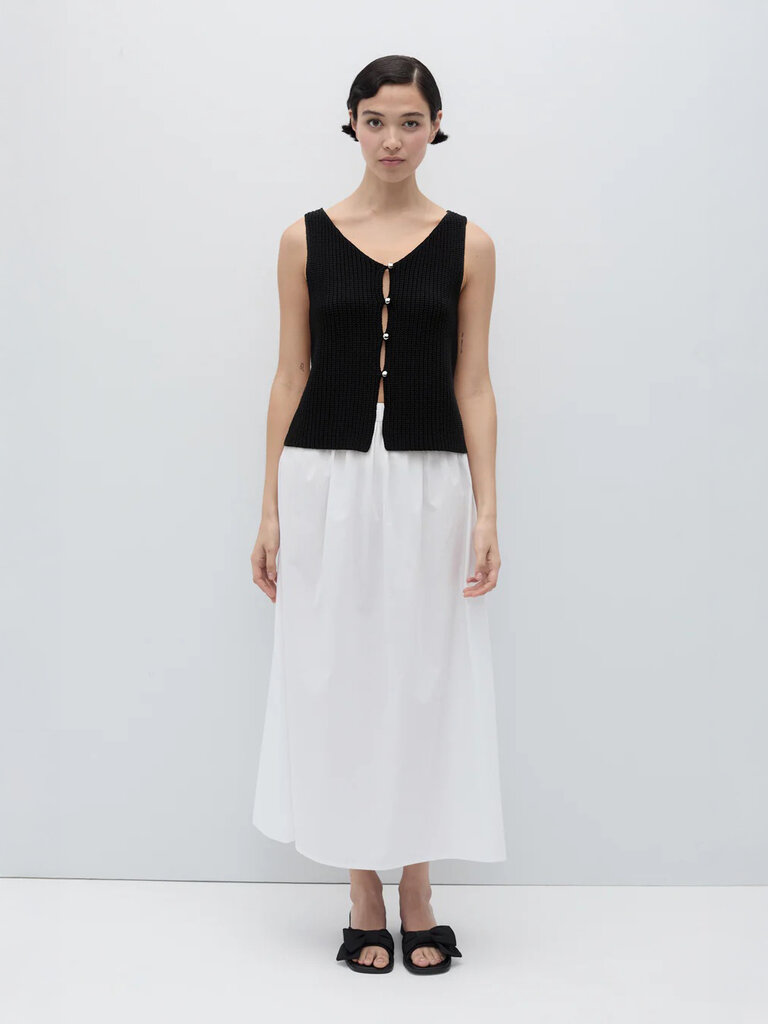 Gilet en maille épaisse en coton ECOTEC doux, avec encolure en V et quatre boutons ronds argentés sur le devant.