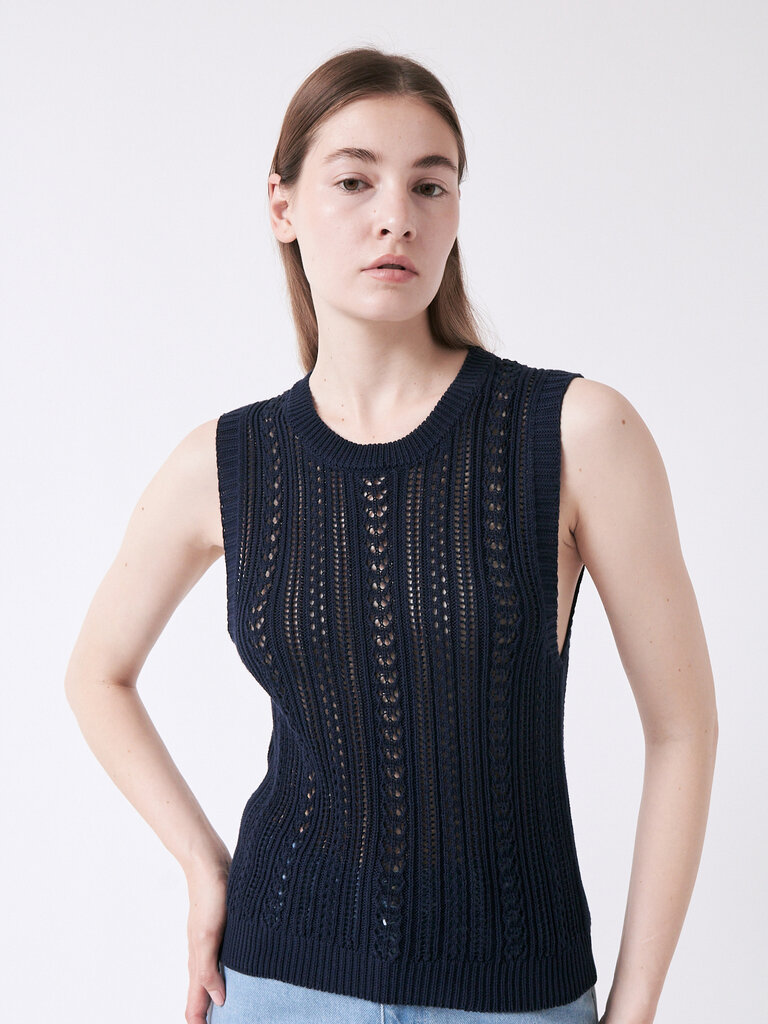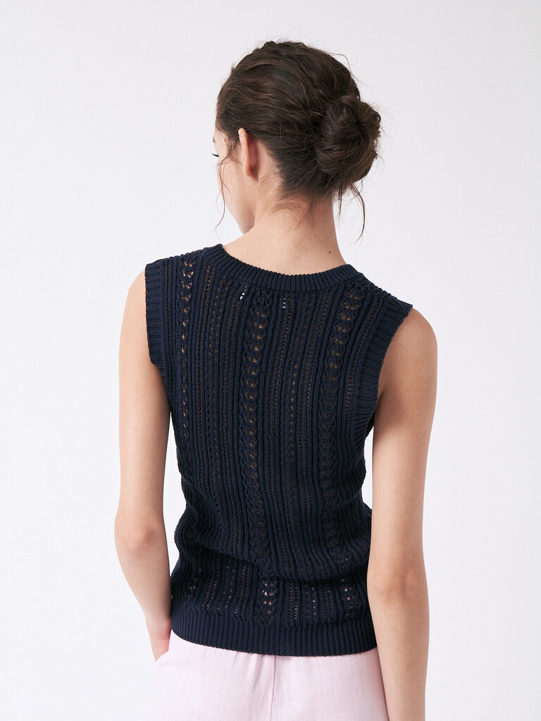 Haut sans manches en maille tricotée délicate, avec un jeu d’ajours subtil pour un rendu léger et respirant. Sa coupe décontractée offre une élégance naturelle, idéale par temps chaud. À porter seul ou en superposition comme un gilet.