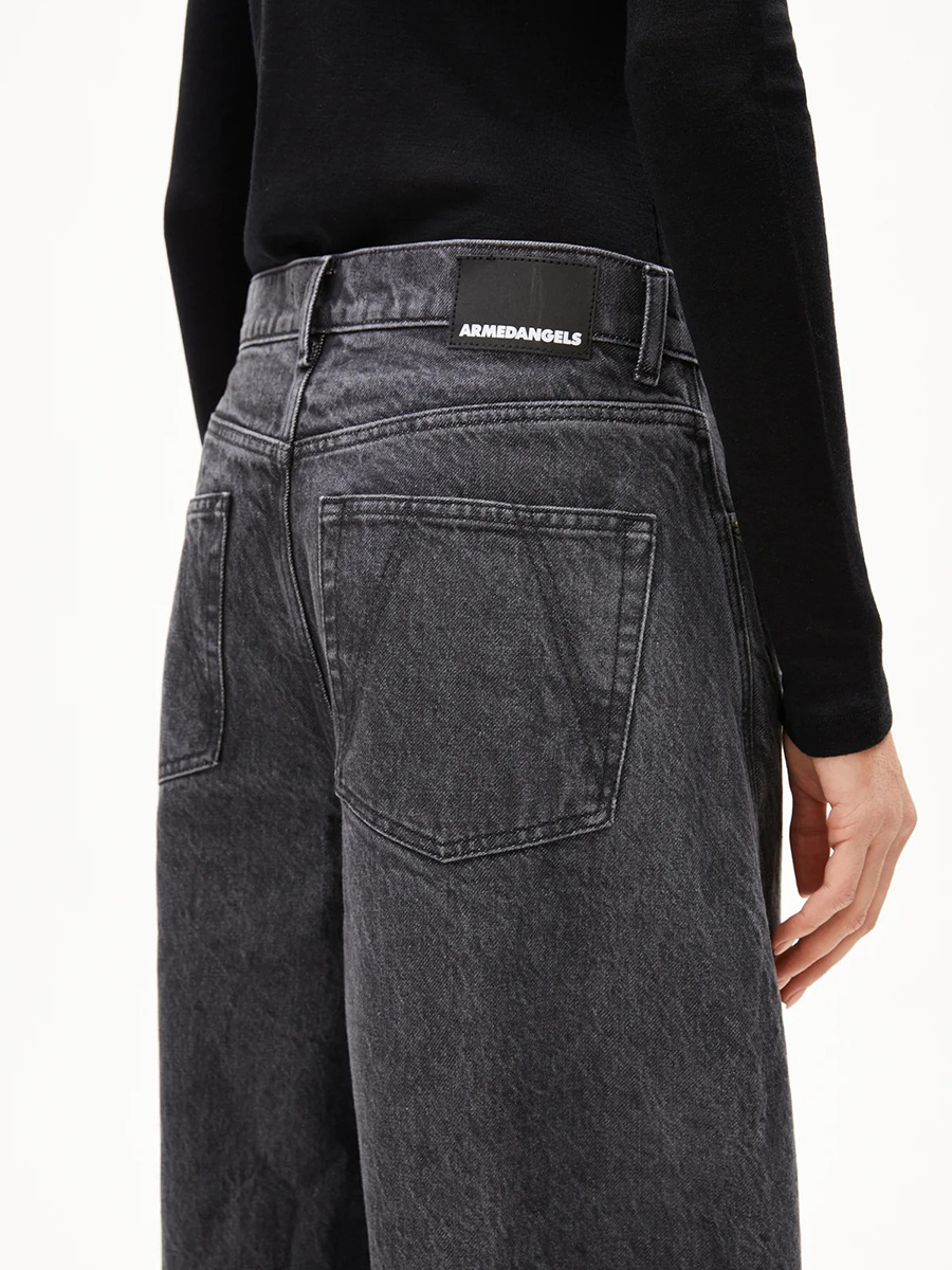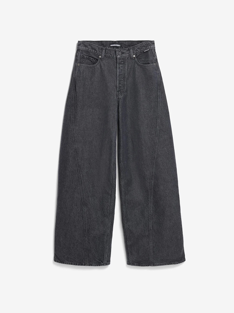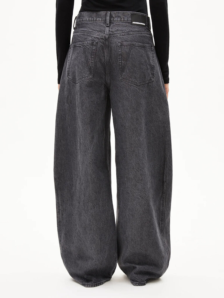 Le jean AALTHEA présente une coupe ballon avec une taille mi-haute. Sa coupe décontractée offre une grande liberté de mouvement, tandis que la couture latérale torsadée apporte une touche distinctive à la jambe.