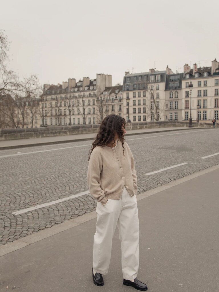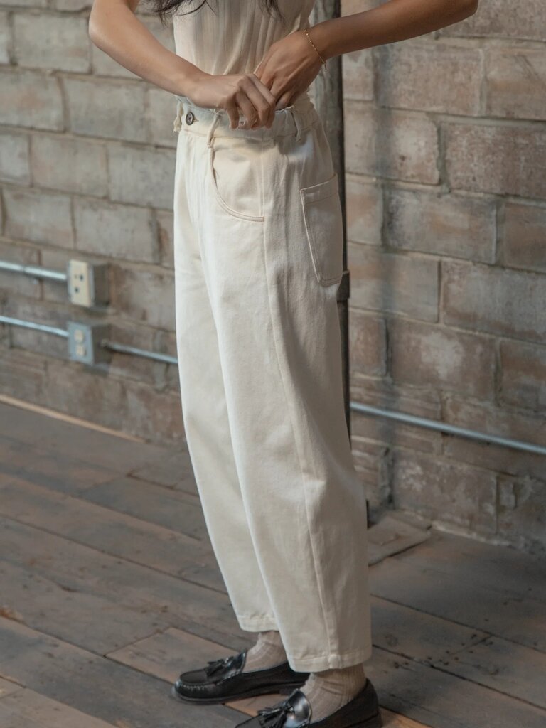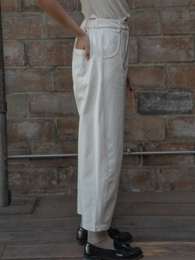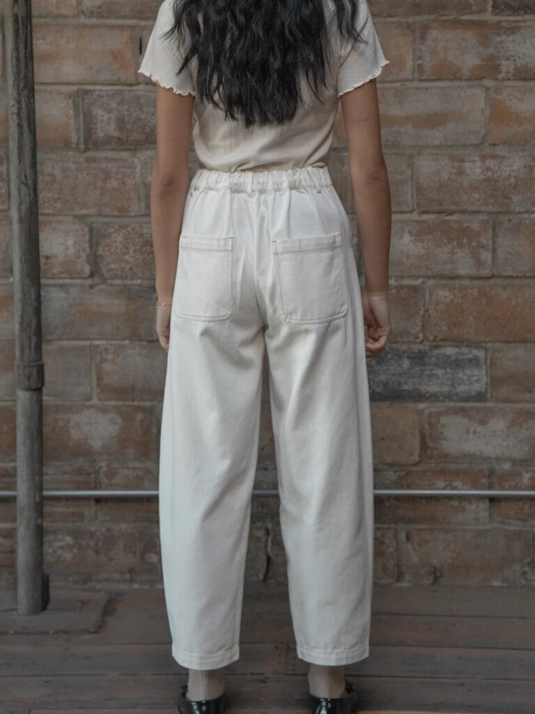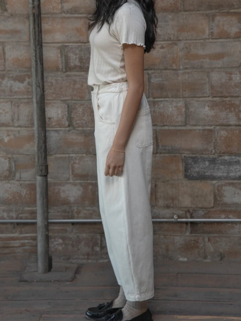Le jean Sophie est un pantalon à jambe ballon avec surpiqûres contrastantes. Il est doté d’une taille partiellement élastiquée pour offrir confort et flexibilité au quotidien.