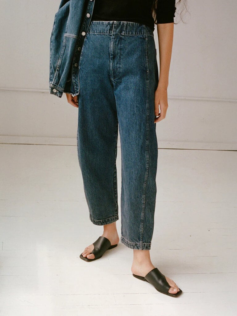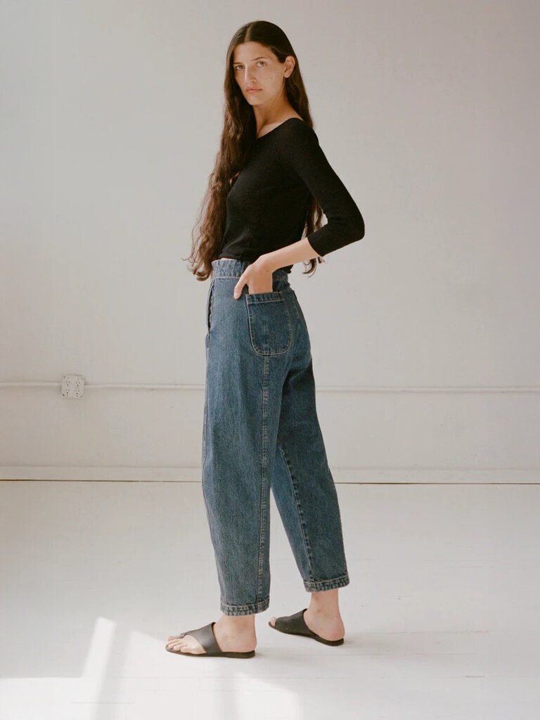 Jean taille haute en denim à la coupe fluide et jambe légèrement ballon. Construction épurée sans ceinture pour un rendu lisse et confortable. Couture latérale continue qui épouse la hanche. Poches à l’avant et à l’arrière.