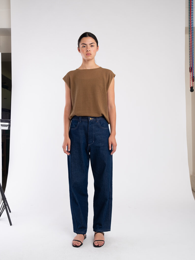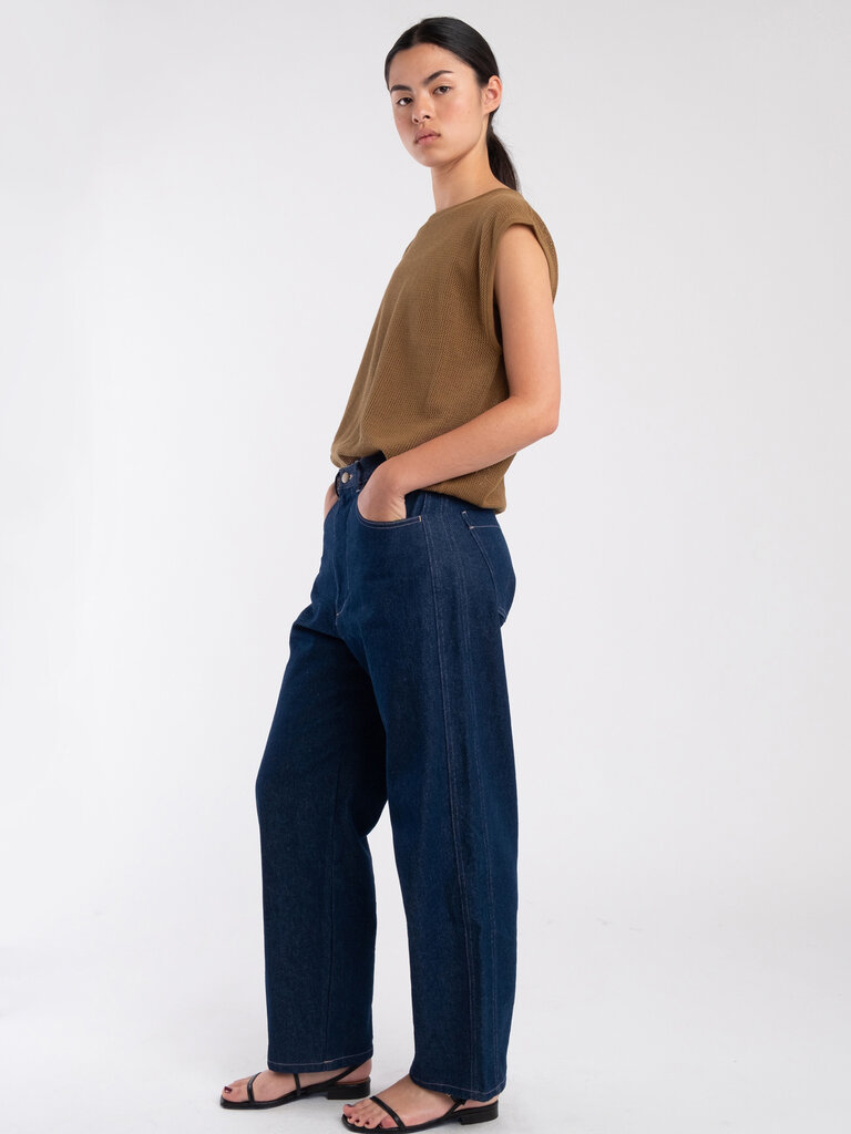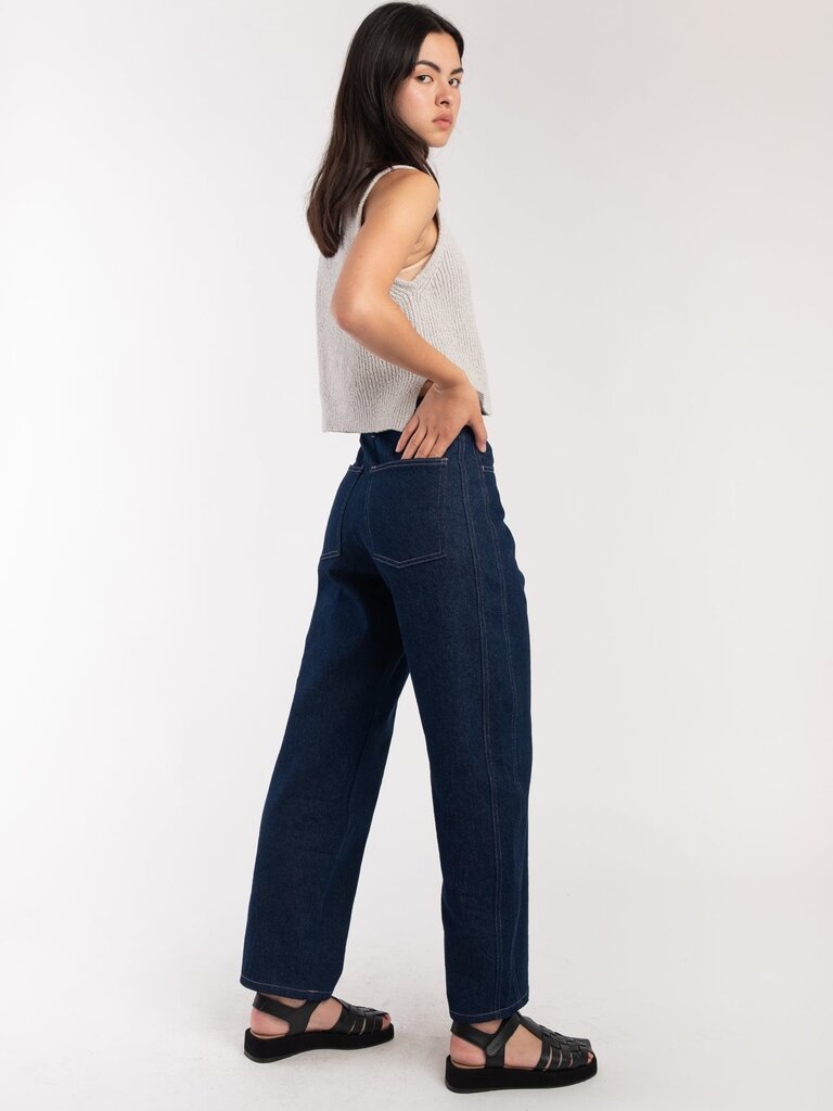 Jean à taille haute, coupe décontractée, avec des empiècements sur les coutures extérieures et une jambe légèrement arrondie. La taille est fidèle, mais vous pouvez prendre une taille supérieure pour une coupe plus large. 100% coton. Fait aux Etats-Unis.