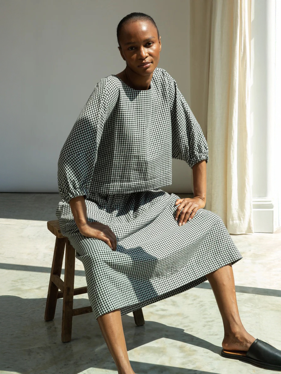 La jupe Goldie est un modèle long coupe trapèze avec une taille élastiquée et des poches latérales. Confectionnée en double gaze de coton biologique, elle offre un toucher doux et un grand confort.
