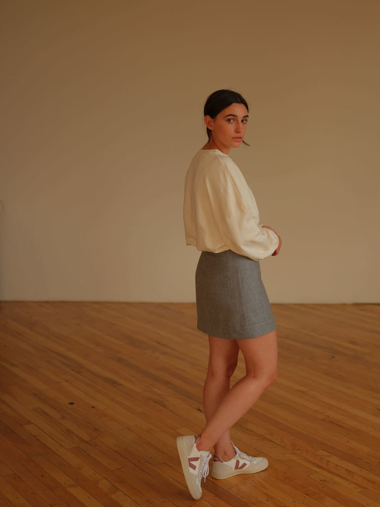 Une jupe courte simple et facile à porter. Idéale pour la saison froide grâce à sa texture douce et enveloppante. Poches passepoilées et fermeture éclair invisible à l'arrière.
