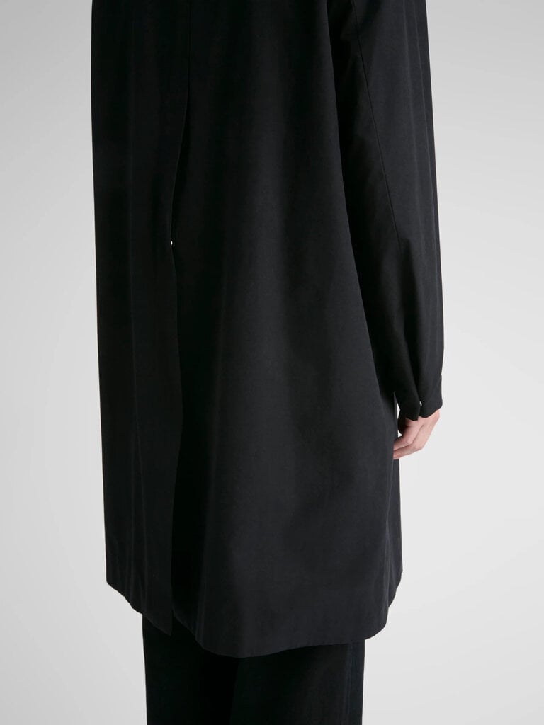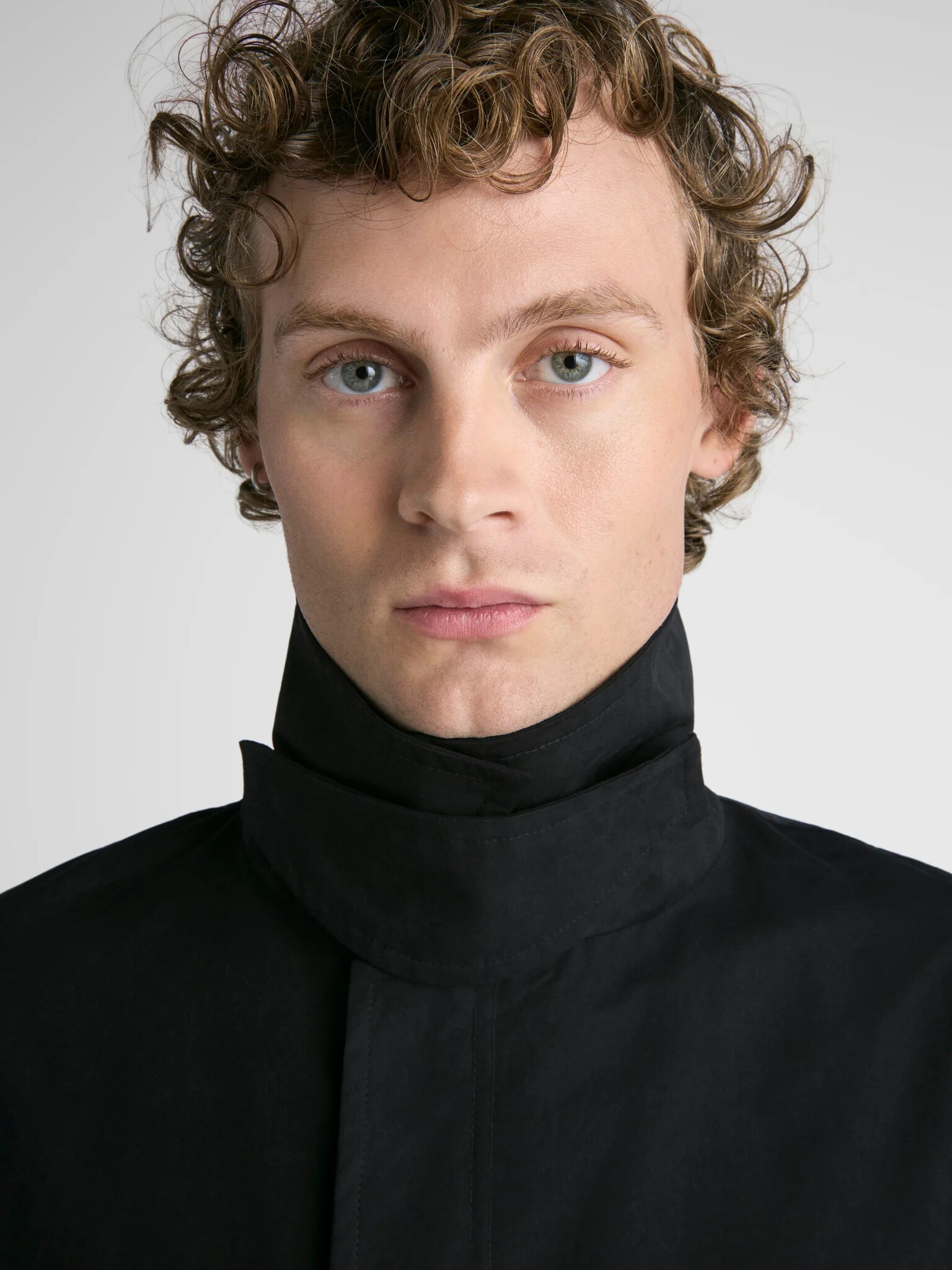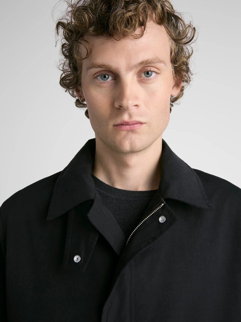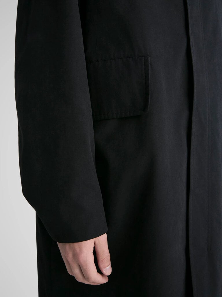 S'inscrireConçu avec des épaules légèrement larges et une coupe ample idéale pour la superposition, ce manteau présente une longue fente arrière pouvant s’ouvrir ou se fermer grâce à des boutons-pression Riri. La silhouette affirmée se distingue par un large col, une patte de gorge amovible et deux grandes poches à rabat à la taille. Fermeture à glissière double YKK sur toute la longueur, dissimulée sous une patte boutonnée Riri.
