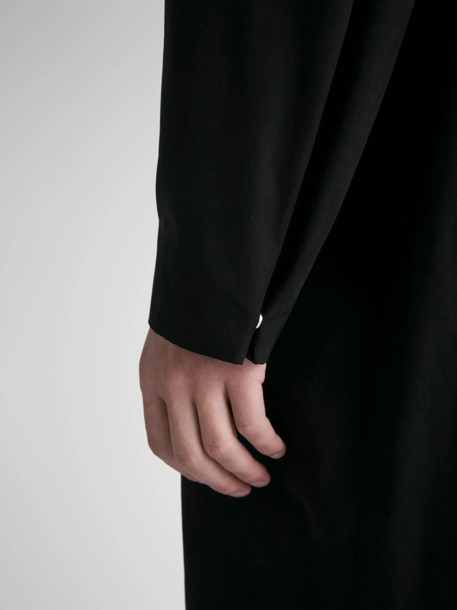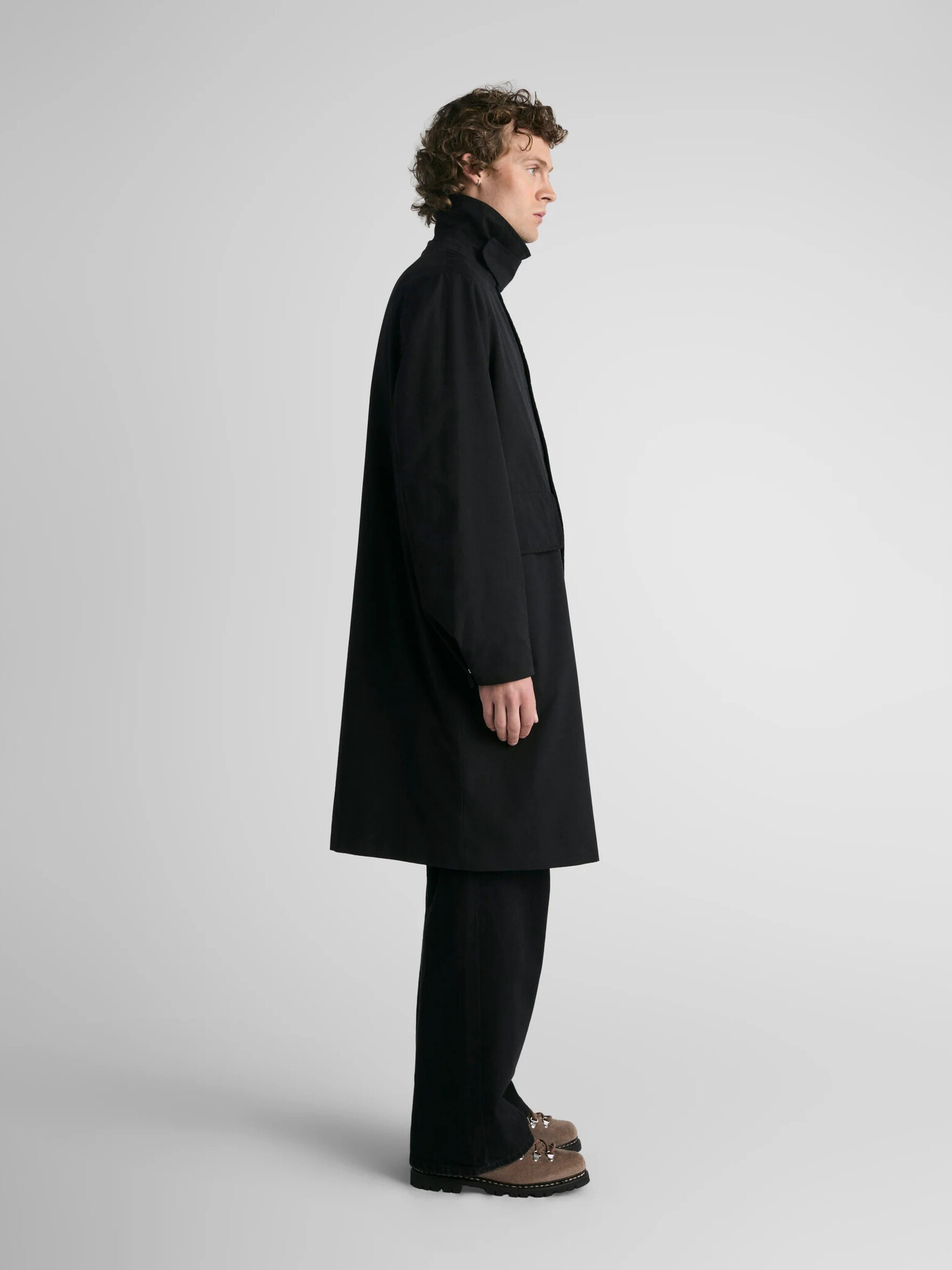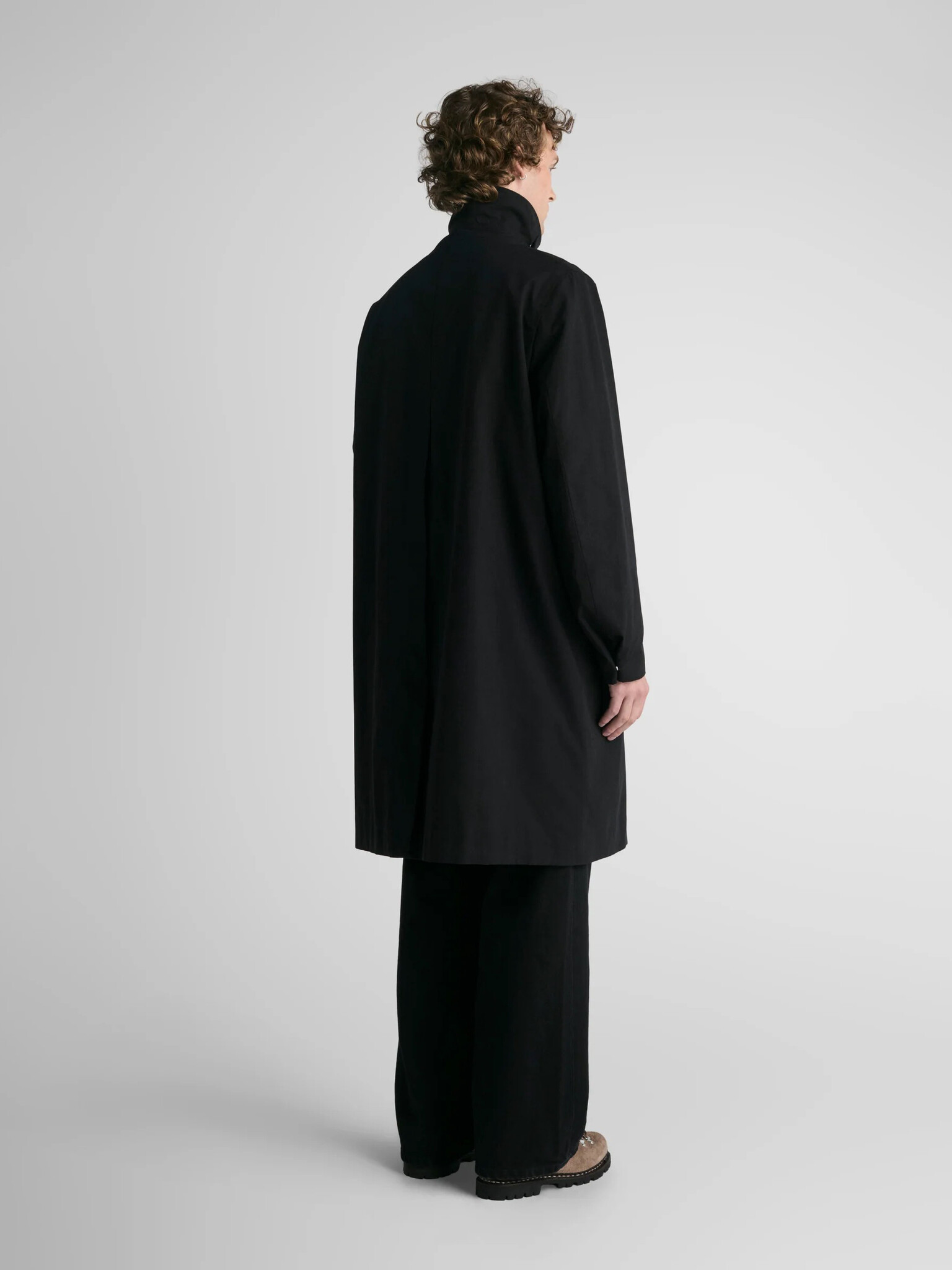 S'inscrireConçu avec des épaules légèrement larges et une coupe ample idéale pour la superposition, ce manteau présente une longue fente arrière pouvant s’ouvrir ou se fermer grâce à des boutons-pression Riri. La silhouette affirmée se distingue par un large col, une patte de gorge amovible et deux grandes poches à rabat à la taille. Fermeture à glissière double YKK sur toute la longueur, dissimulée sous une patte boutonnée Riri.