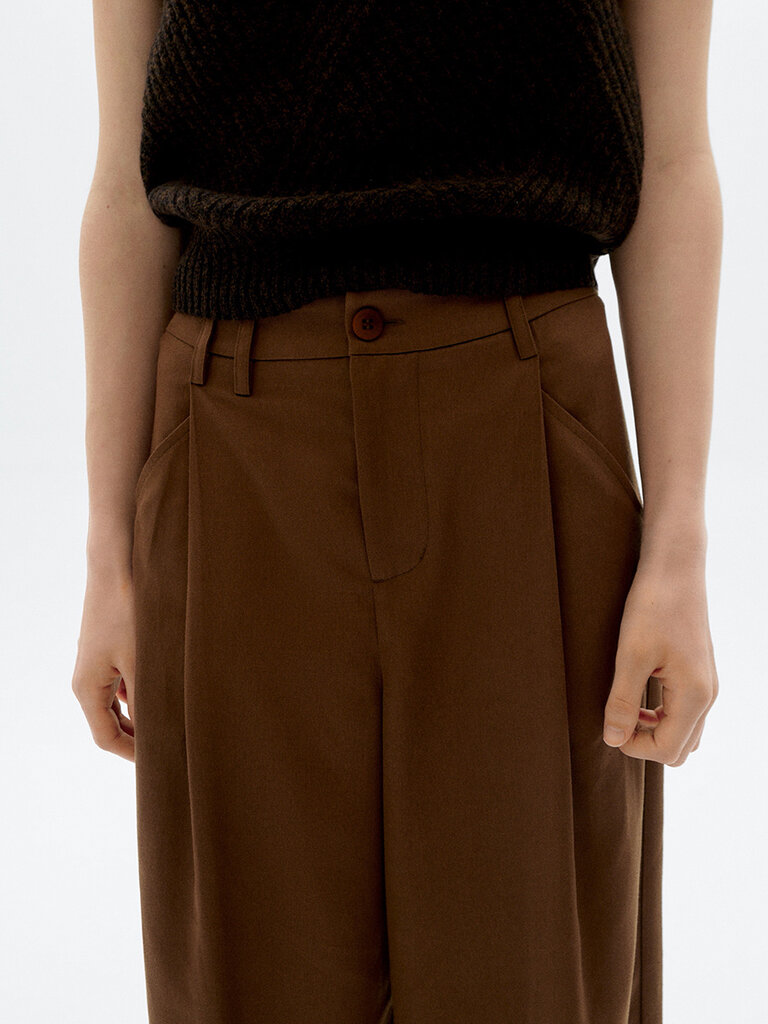 Pantalon Molly marron à plis et jambes larges, confectionné en Tencel.