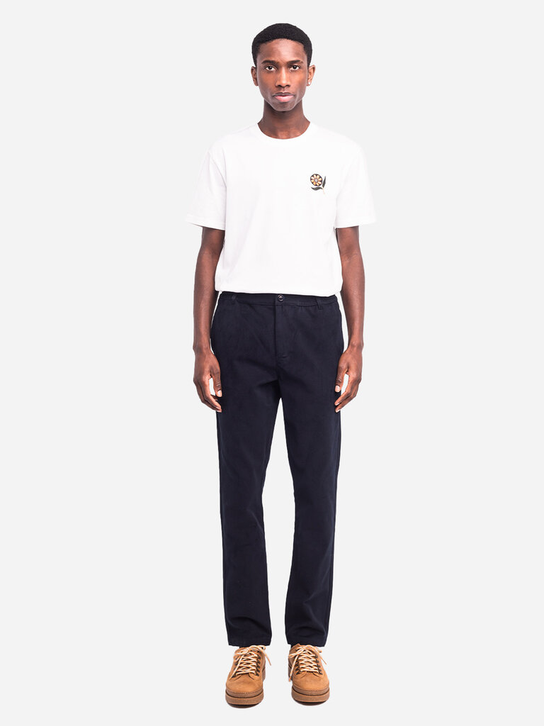 Pantalon doux et confortable 100% coton biologique. Taille élastique. Zipper YKK et boutons en corozo. Deux poches sur les côtés et deux poches arrières passepoilées à bouton. Coupe droite. Dessiné en France, fabriqué de façon éthique au Portugal.