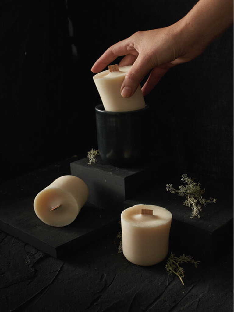 Composition | Cire de soya, huiles essentielles et mèche de bois - Les emballages beiges ont été fabriqués avec les retailles de vêtements Esser et nous vous suggérons de les utiliser comme serviette de table. |