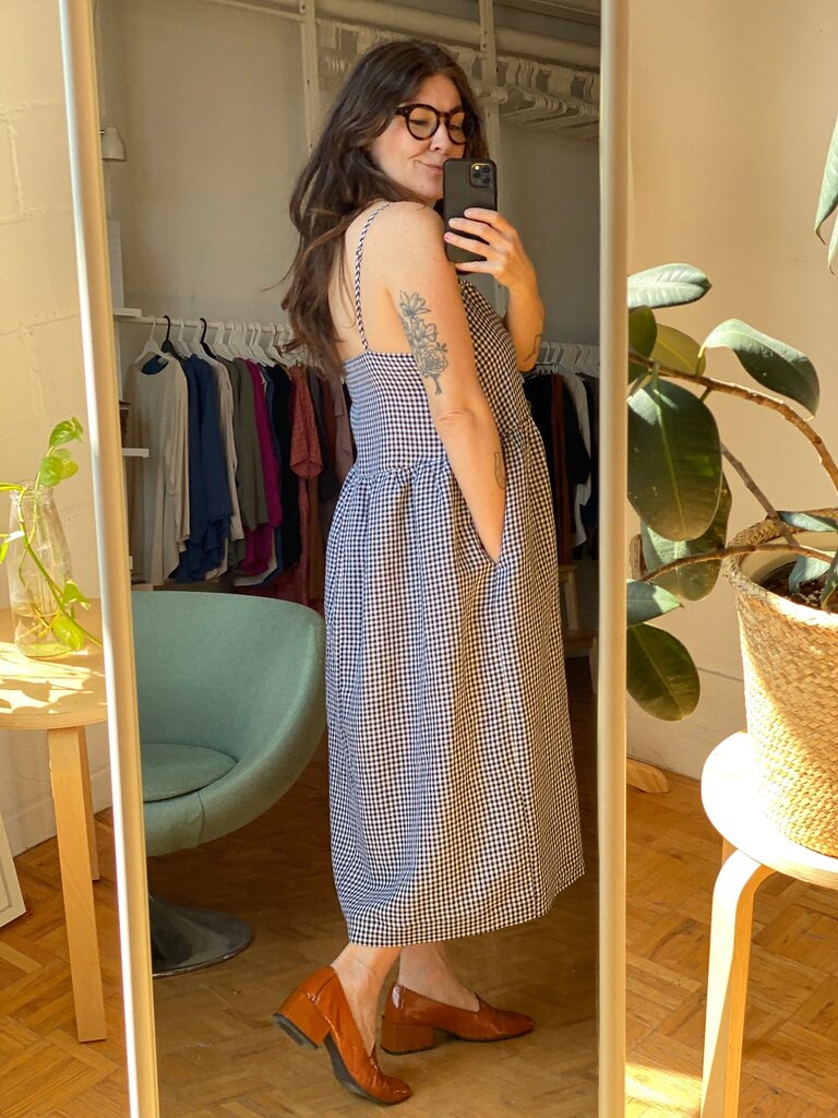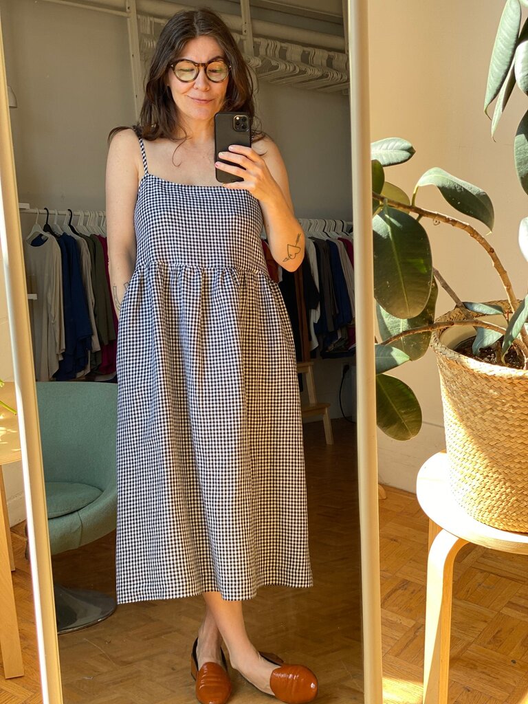 Robe à coupe volontairement généreuse, conçue pour un confort intemporel. Peut être portée seule ou superposée lors des jours plus frais. Taille empire avec jupe froncée et poches cachées sur les côtés. Bretelles spaghetti réglables. 80% lin 20% coton.