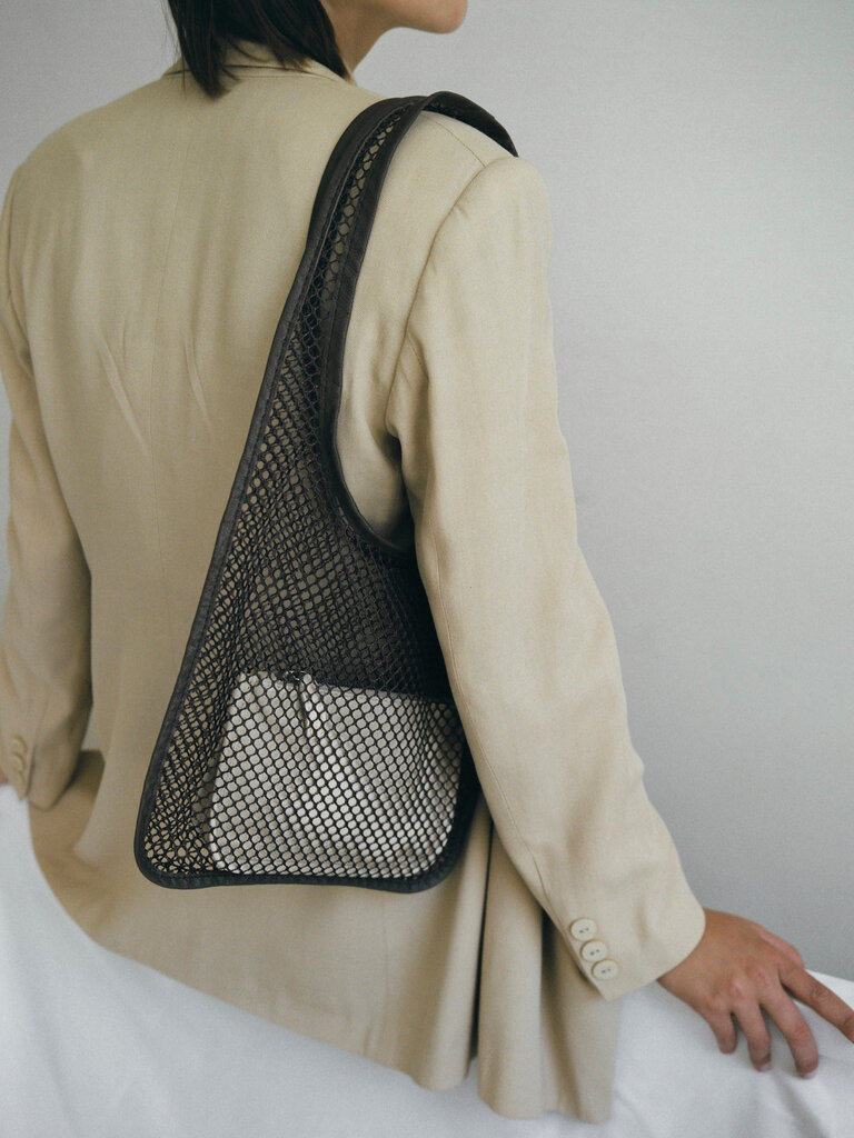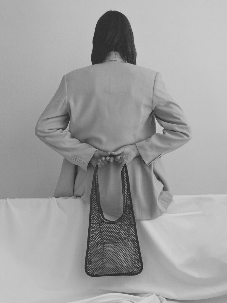 Le sac Field est fabriqué en filet résistant avec des finitions en cuir issues de retailles de la production de sacs Are Studio. Idéal pour les sorties de jour comme de soir, il s’agence parfaitement avec les pochettes Gia.