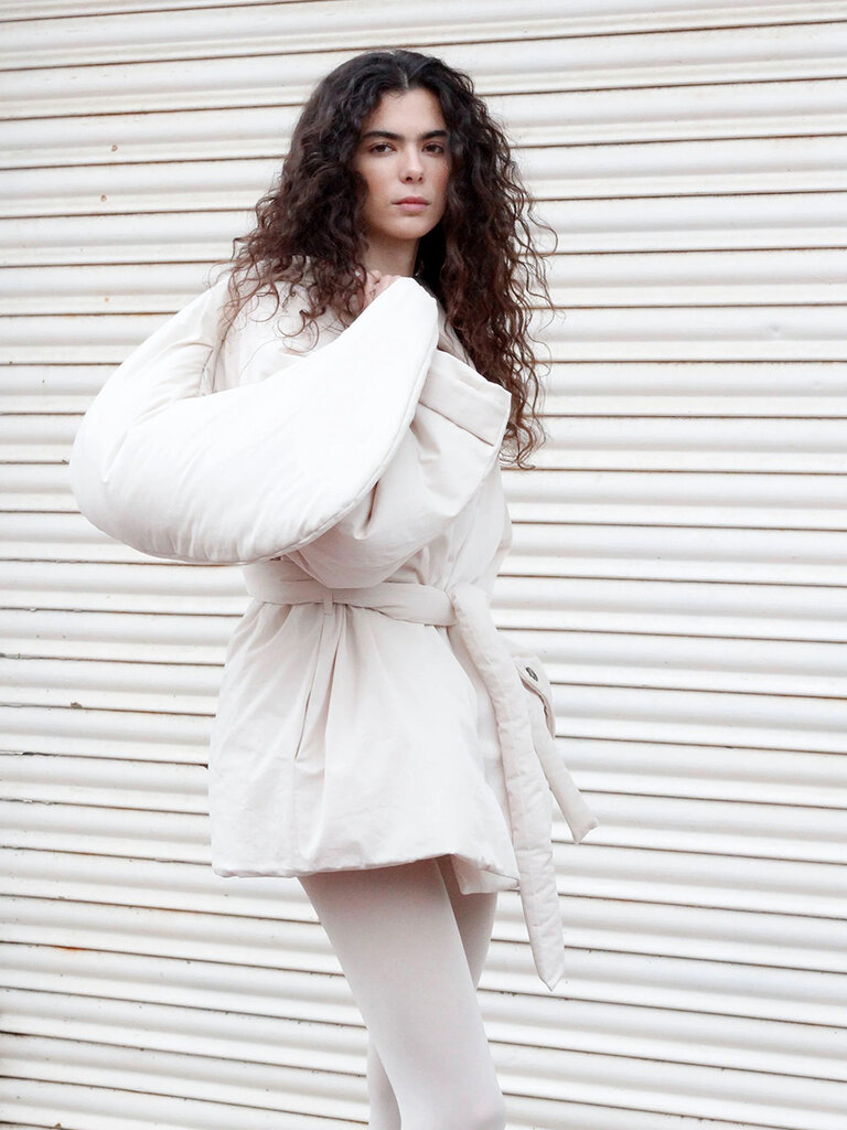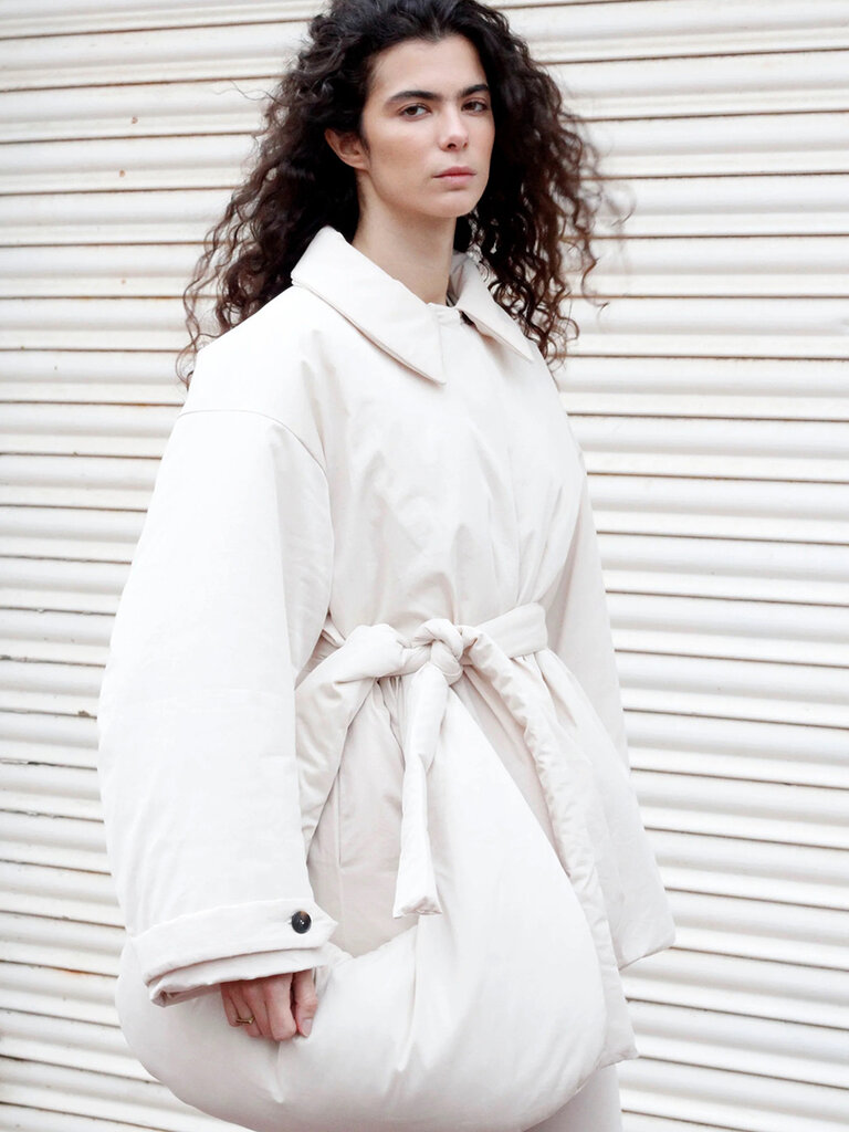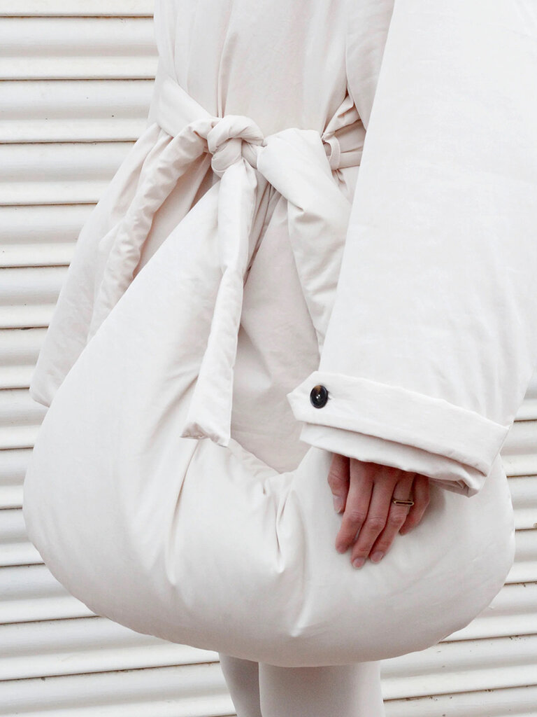 Ce sac matelassé sculptural redéfinit les concepts de douceur et de forme. Confectionné avec une silhouette volumineuse et une texture lisse, il évoque le confort des vêtements d’extérieur tout en affirmant un style audacieux et moderne.
