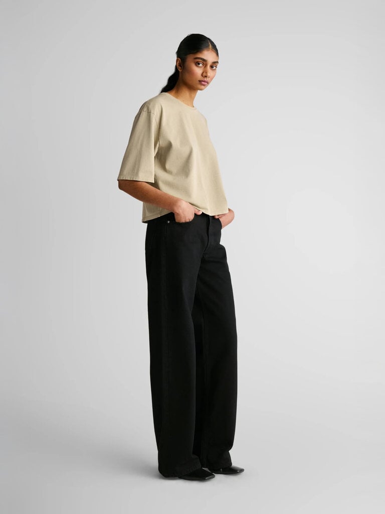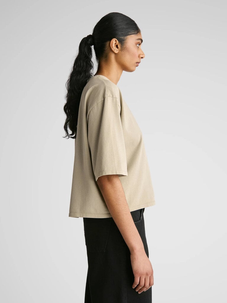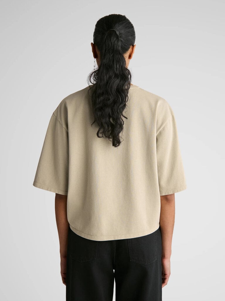 Le t-shirt Abby présente des épaules tombantes, des manches courtes larges et plus longues, ainsi qu’une silhouette généreuse, pour une coupe boxy revisitée.