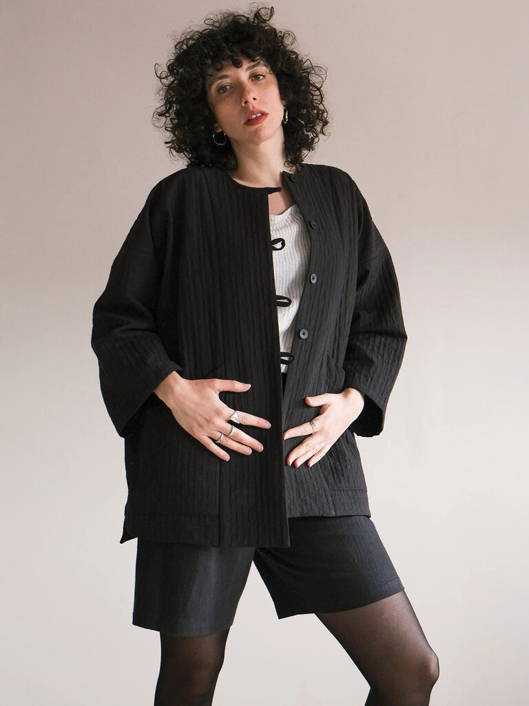 Inspirée du kimono, cette veste allie élégance et légèreté. Son jacquard de coton texturé, doux au toucher, assure un confort optimal. Revers larges, boutons et poches plaquées structurent la silhouette, tandis que des fronces au dos ajoutent du mouvement