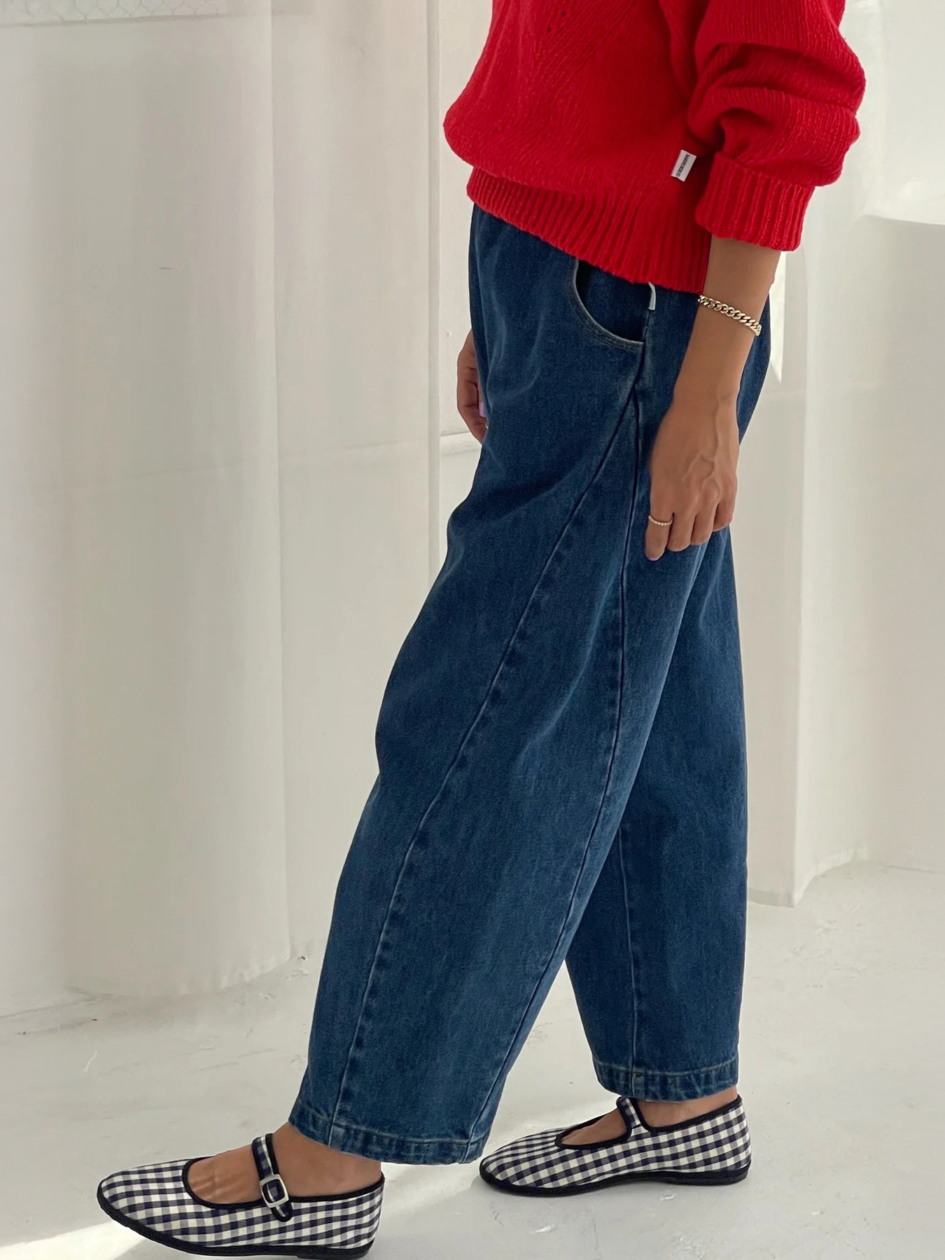 The Arc pants feature a slightly curved, cropped leg, side panels, and deep pockets. Their high elastic waistband provides optimal freedom of movement, and their heavyweight canvas provides durability and structure.