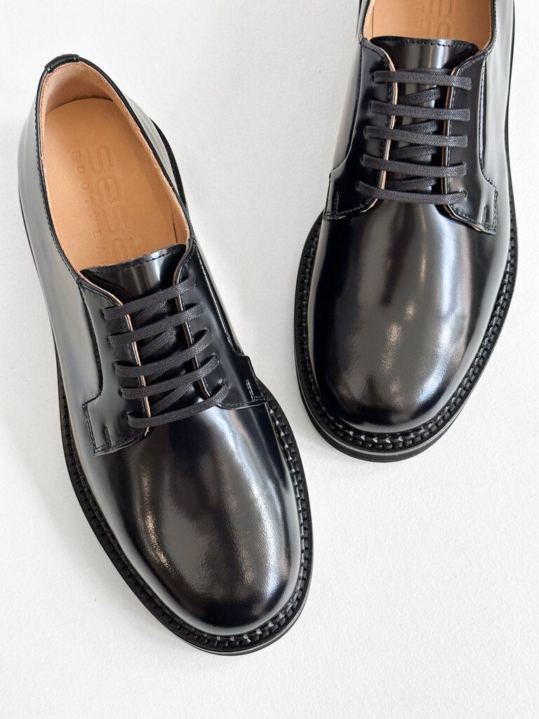Baltimore is a classic shoe made of shiny leather, featuring 5 eyelets, a natural leather lining, and a lightweight, non-slip, handmade rubber sole. It's perfect for dressing up or down, and can be worn for any occasion.