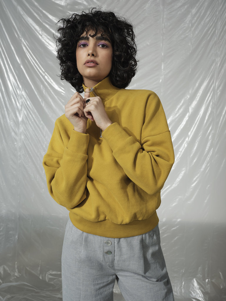 A cozy sweater in a soft brushed cotton fabric. Zipper opening with a metal ring, giving it a retro touch.