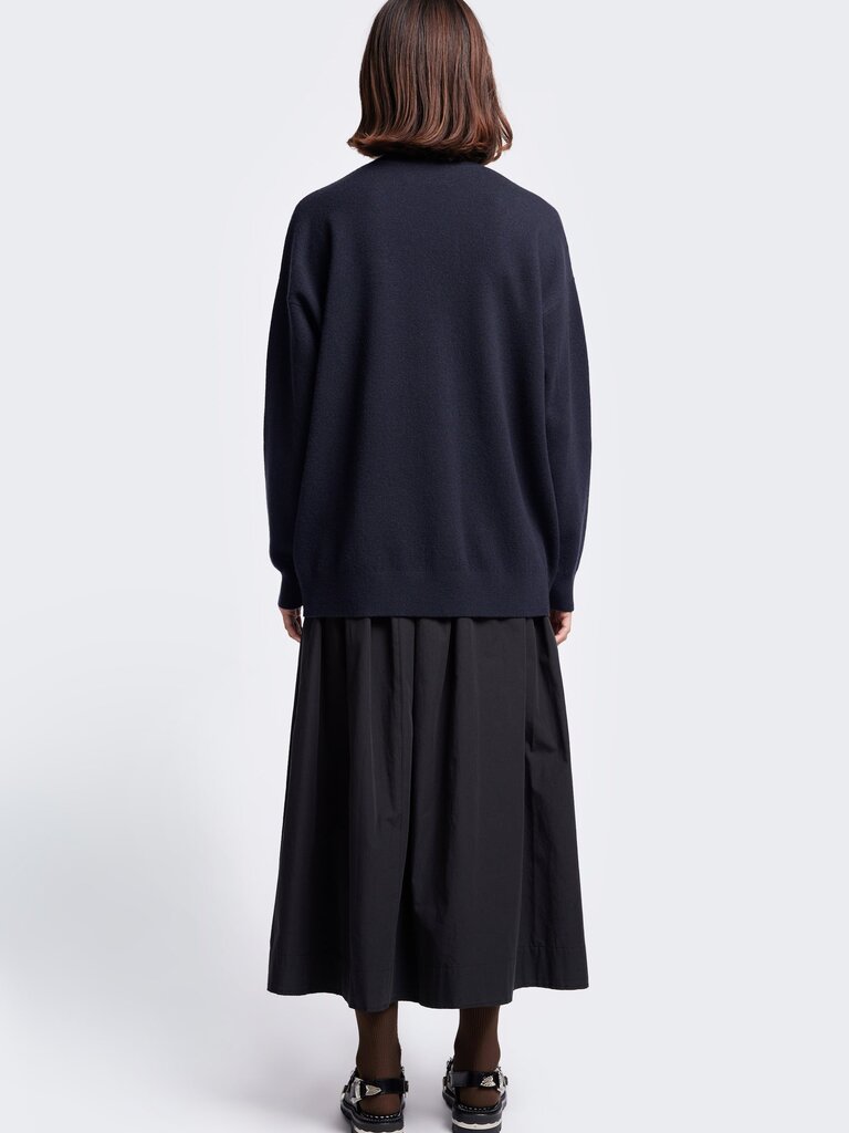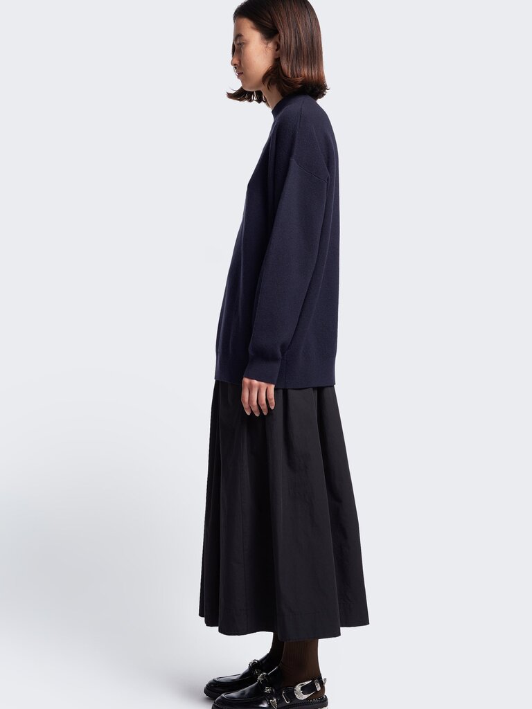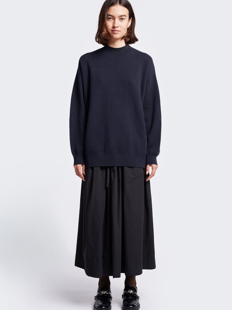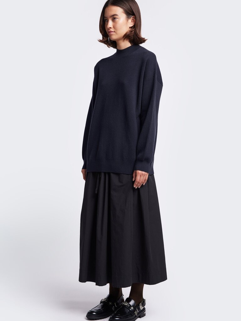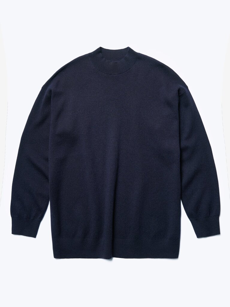 A mock neck merino sweater crafted in a milano knit structure. Accented with a dropped shoulder and long line of the body, finishing just below the hips with a 1x1 rib hemline. 100% Merino Wool. Gentle cold hand wash.