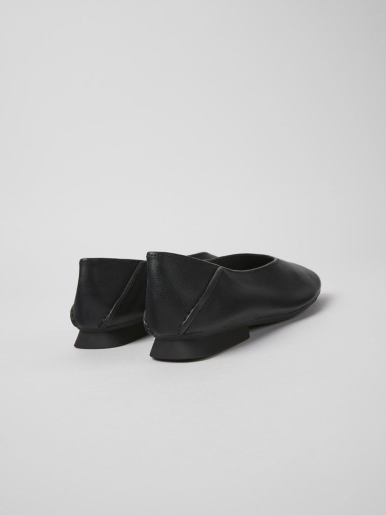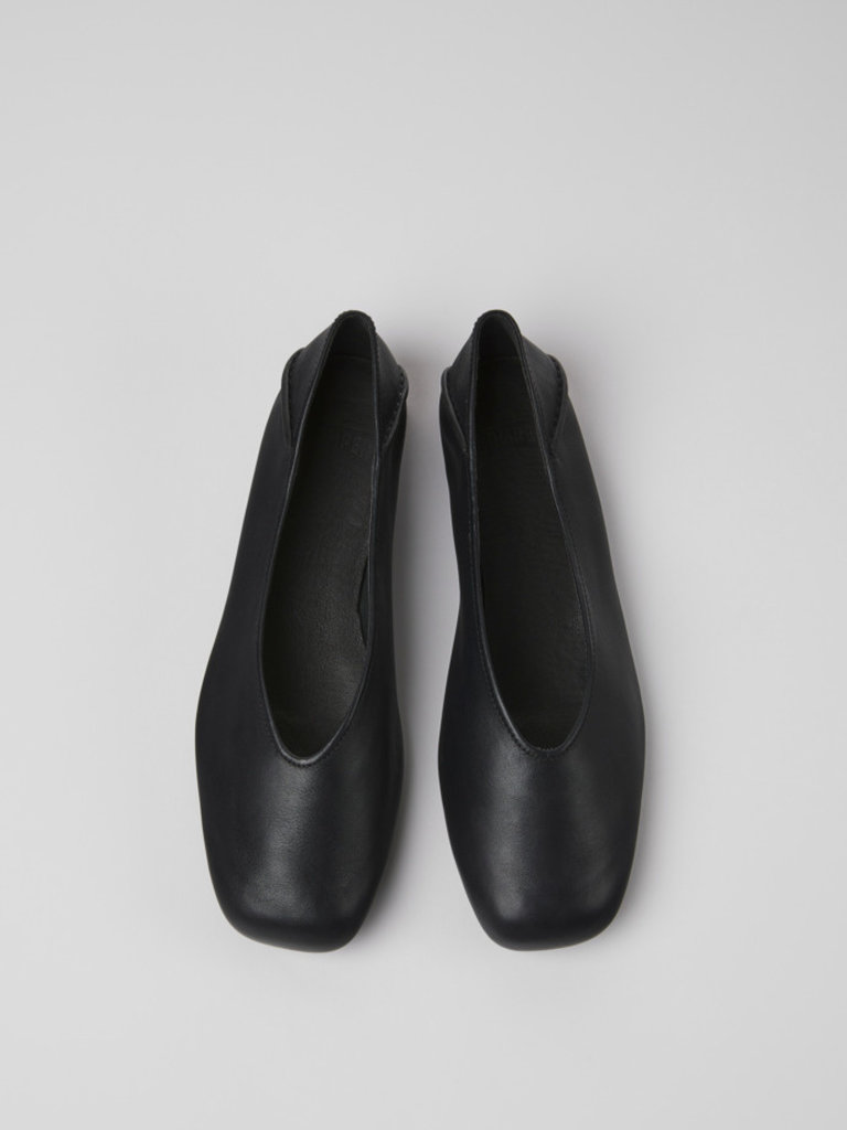 Black leather women's ballerina flats with OrthoLite® Recycled™ non-removable footbeds and TPU outsoles (20% recycled). Timeless design with a slightly squared shape. Leather Working Group Certified leather. Camper is a BCorp certified company.