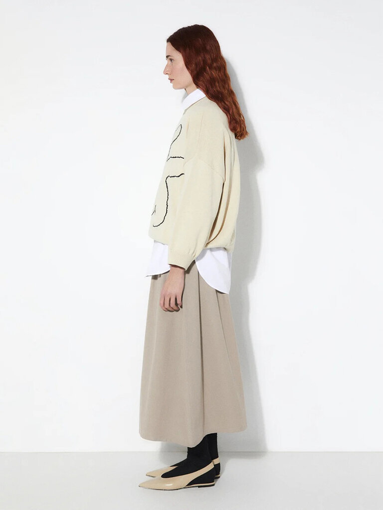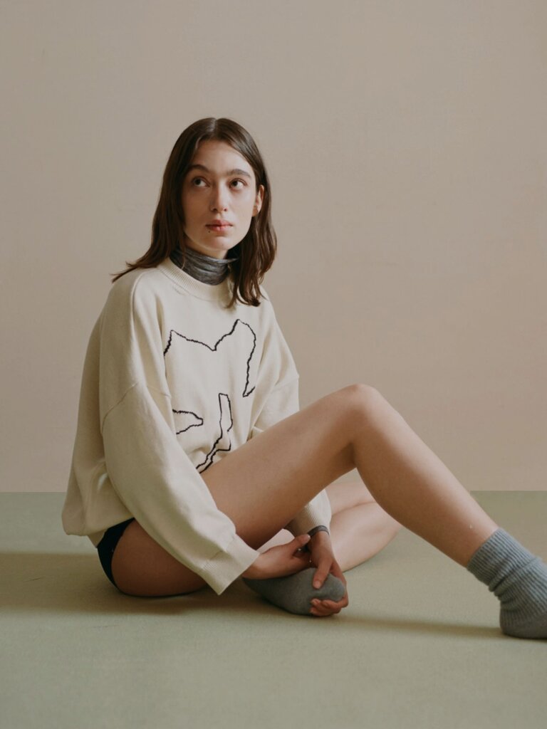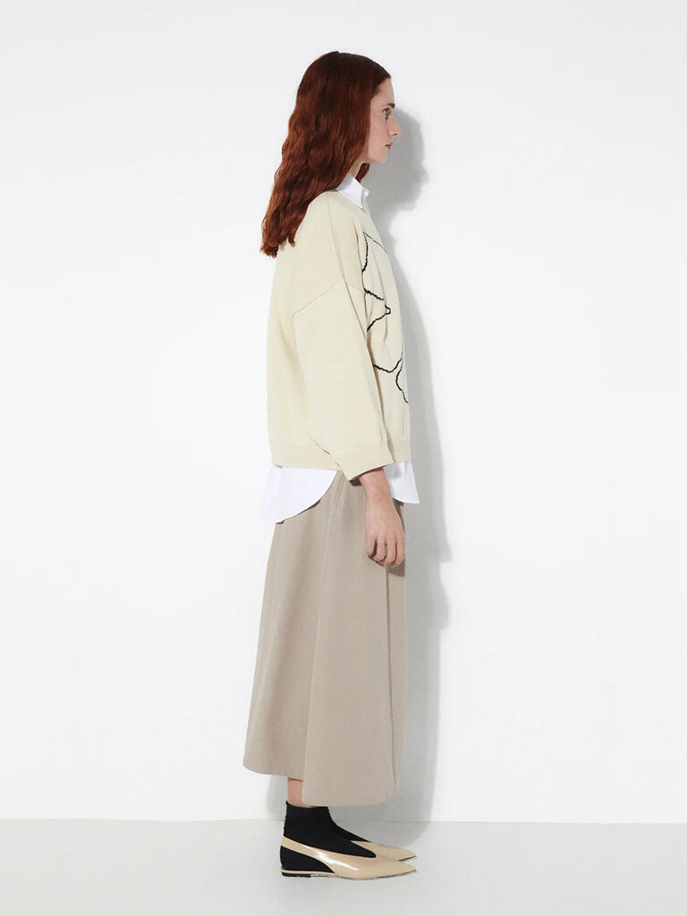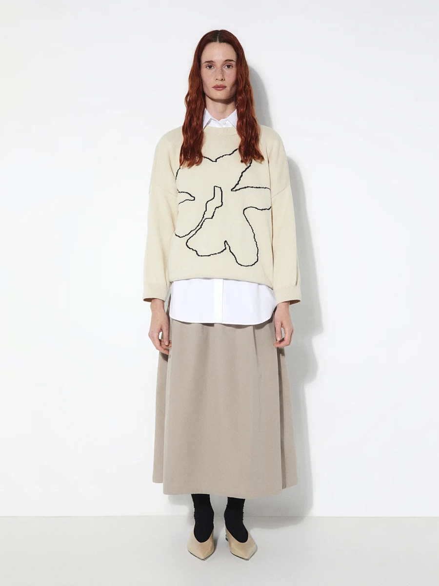 Soft knit sweater with front detail of a flower silhouette. Round neckline with ribbed trim. Drop-shoulder style with ribbed trim on cuffs and hem.