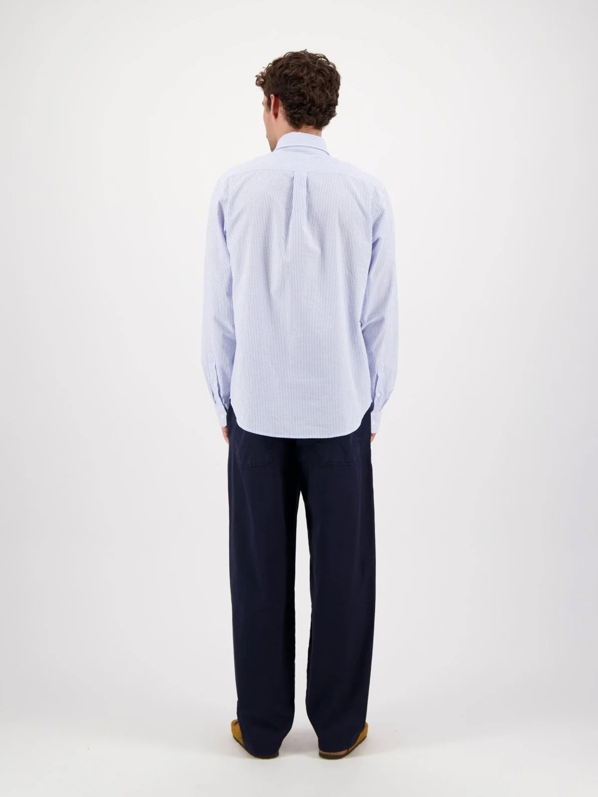 The Konga shirt is made from seersucker fabric with a slight crinkle that adds subtle texture and visual interest. The breathable construction makes it ideal for warmer days, while the hidden button-down collar keeps the silhouette clean and refined.