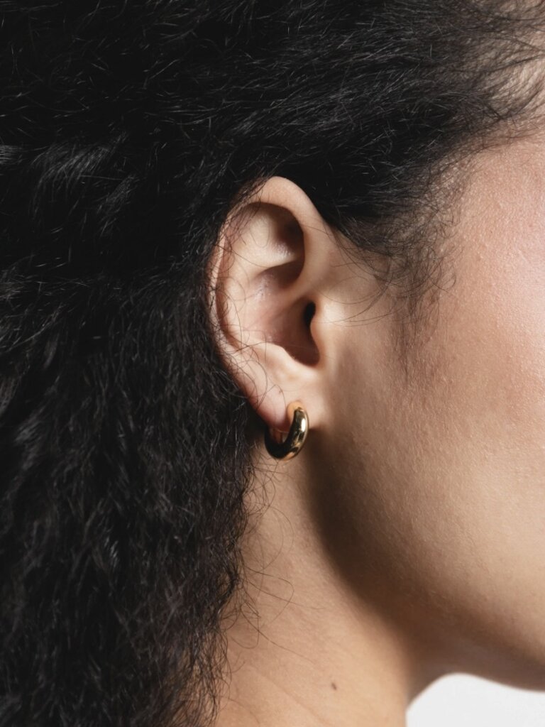 Chunky hoop earrings, plated in 14k gold, with gold vermeil posts. A sleek, modern design that combines golden shine with comfort, perfect for enhancing any outfit with a sophisticated, contemporary touch.