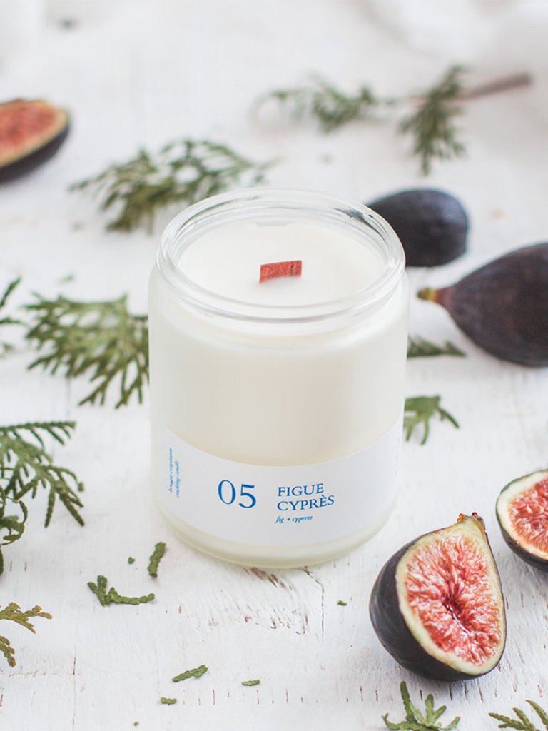 100% pure soy wax candle fig and cypress scented. As revitalizing as a walk in the forest. The wooden wick creates a soft crackle.