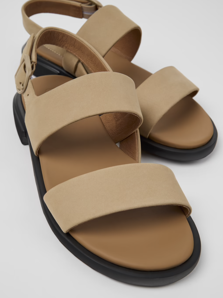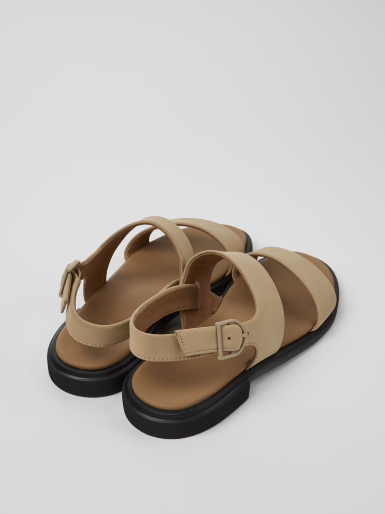 Women's leather sandals with a recycled OrthoLite® insole. Their anatomical shape, rounded toe, lightweight sole, and low heel give them a casual, elegant, and handcrafted look.