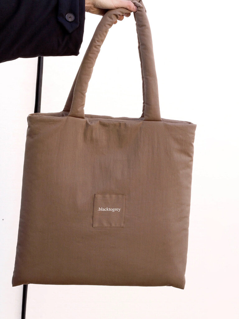 Lightweight yet spacious, this padded tote bag blends utilitarian ease with sculptural softness. Featuring a structured silhouette and wide cushioned straps, its minimalist design is accented by a tonal stitched logo, adding a subtle graphic touch.