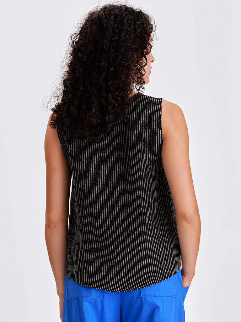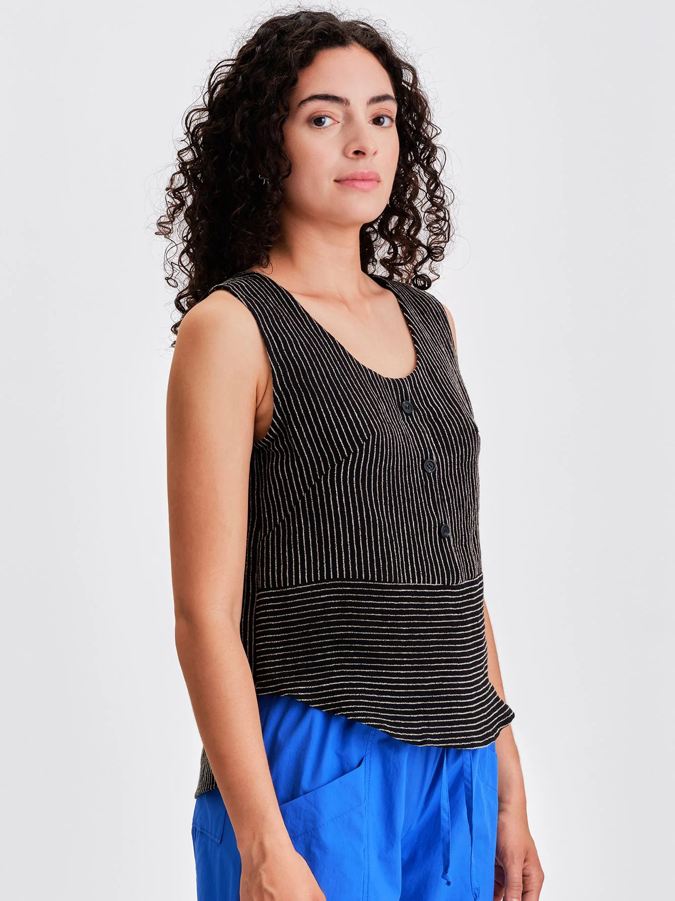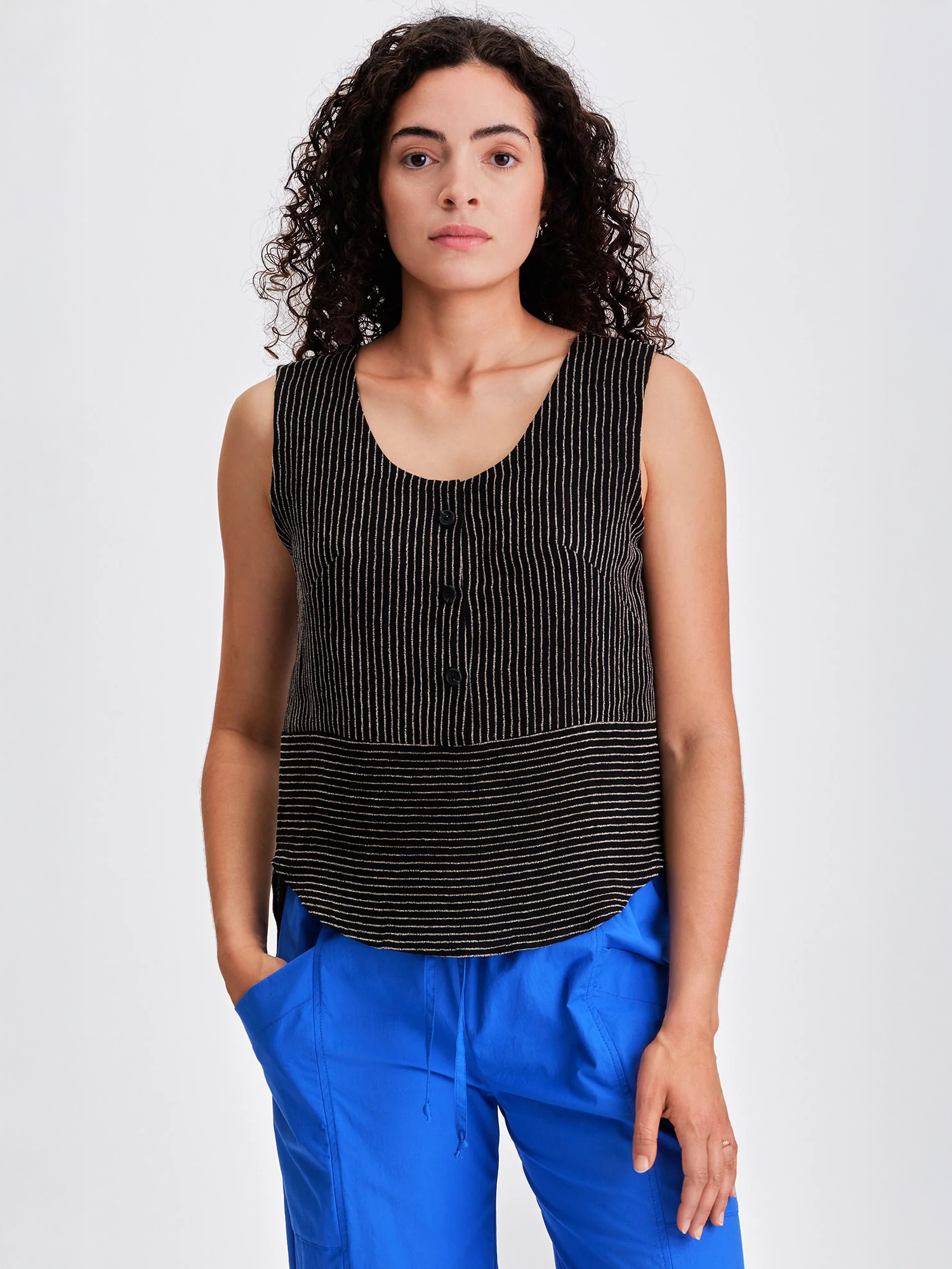 A sleeveless essential with charming details, the Deva top features a rounded neckline and a trio of front buttons. Luxurious striped fabric adds playful contrast, while a rounded hem allows it to be tucked in or worn loose.