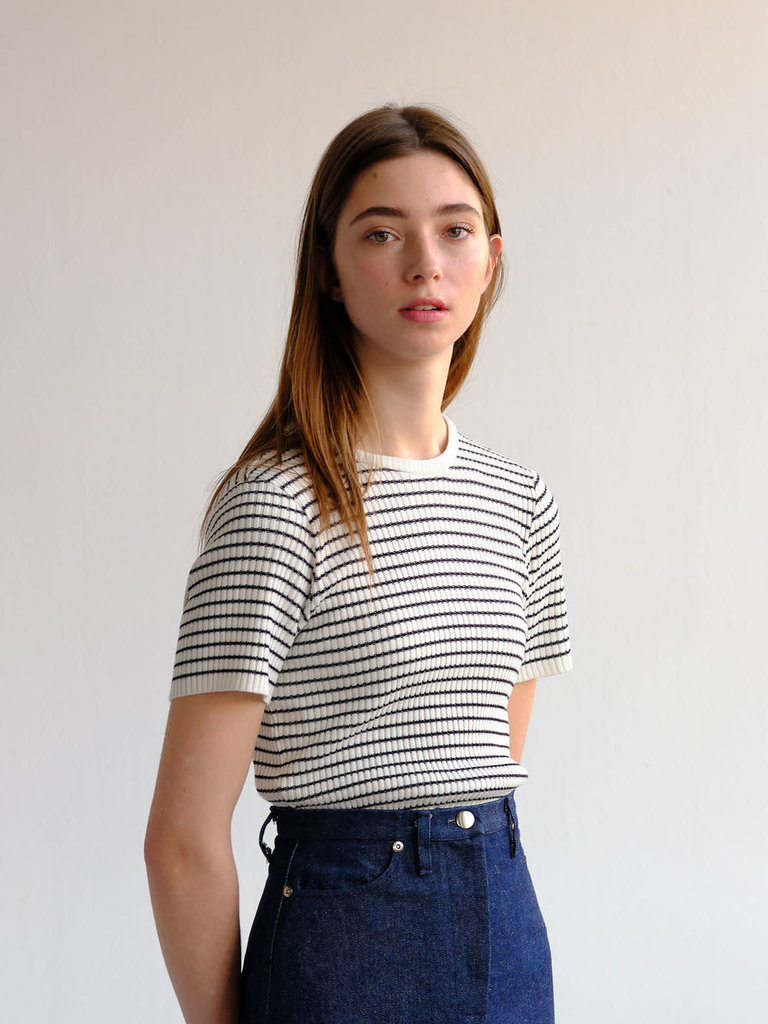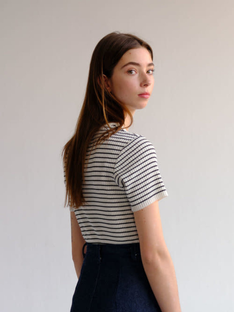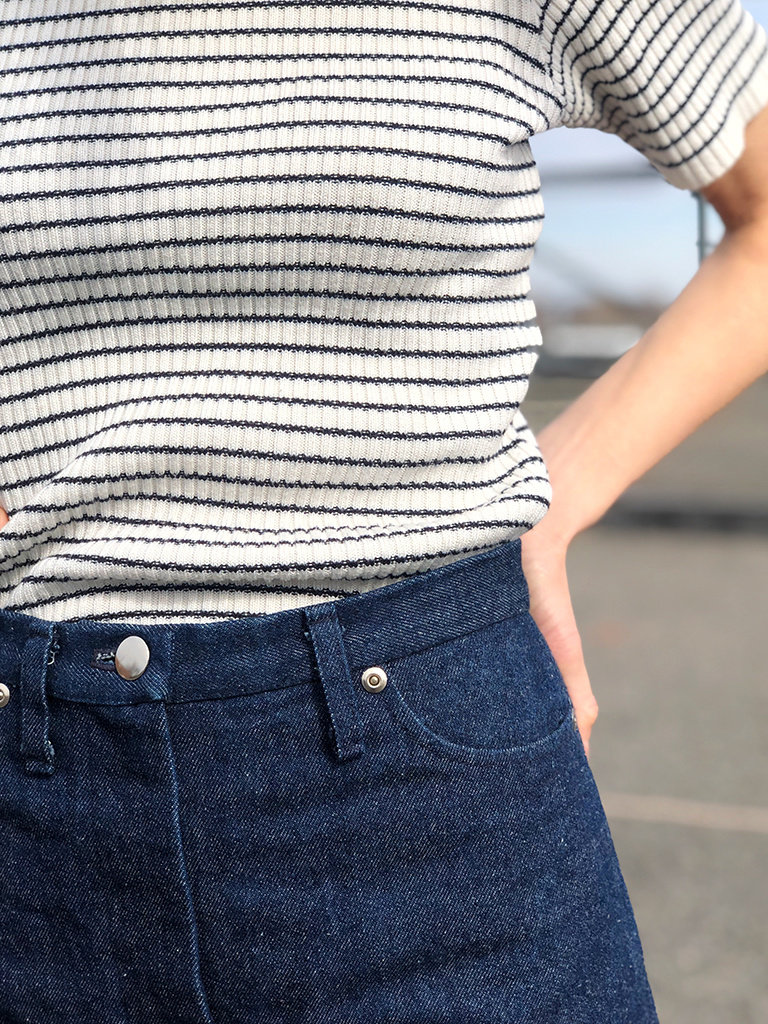 This top pairs well with any high-waisted bottom. Made from a stretchy bamboo jersey that doesn’t pill. Crew neck and slim fit.