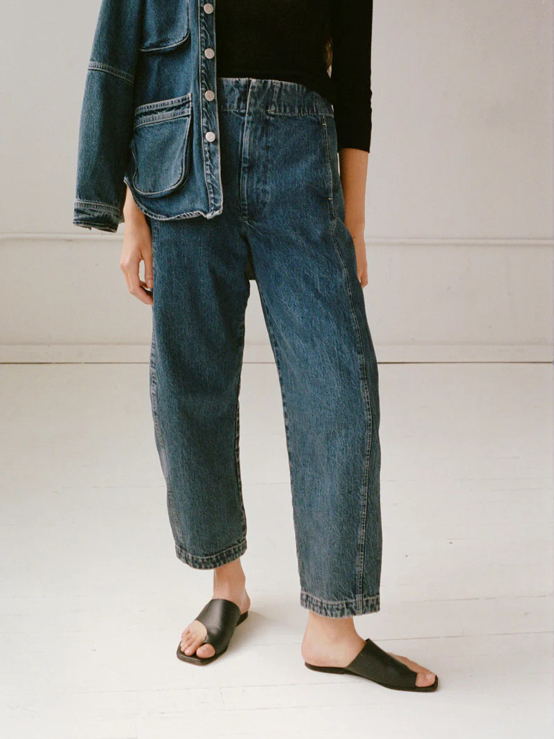 High-rise denim jeans with a fluid fit and subtly ballooned leg. Clean, waistband-free construction for a smooth feel. Continuous side seam that follows the hip. Front and back pockets.