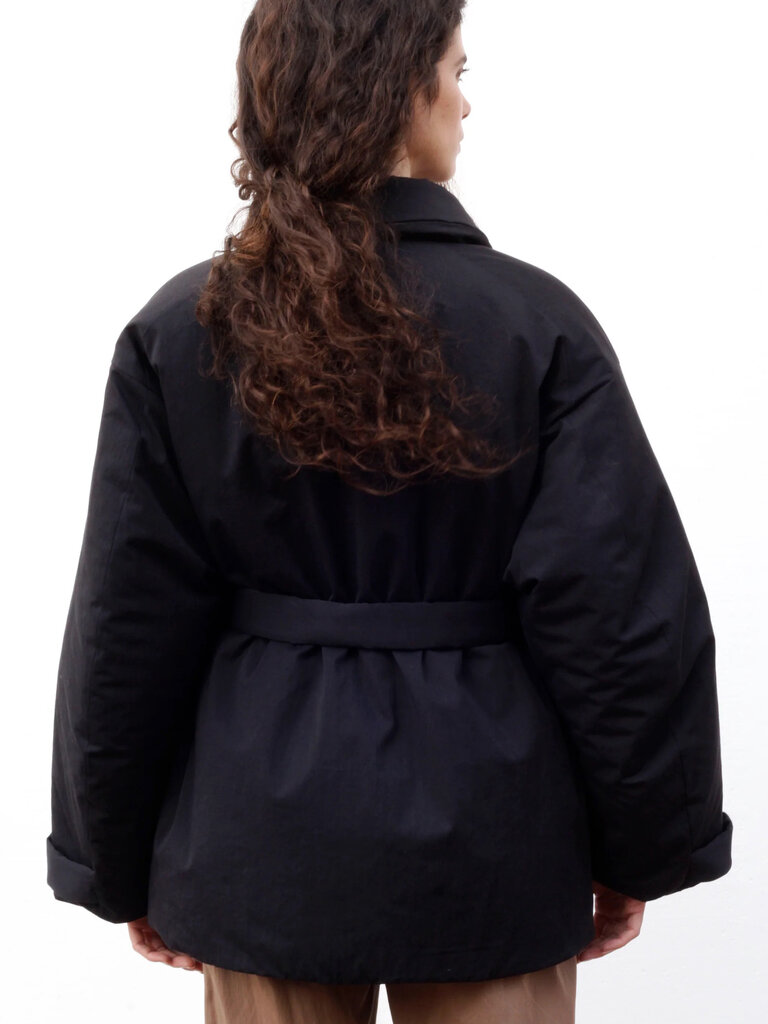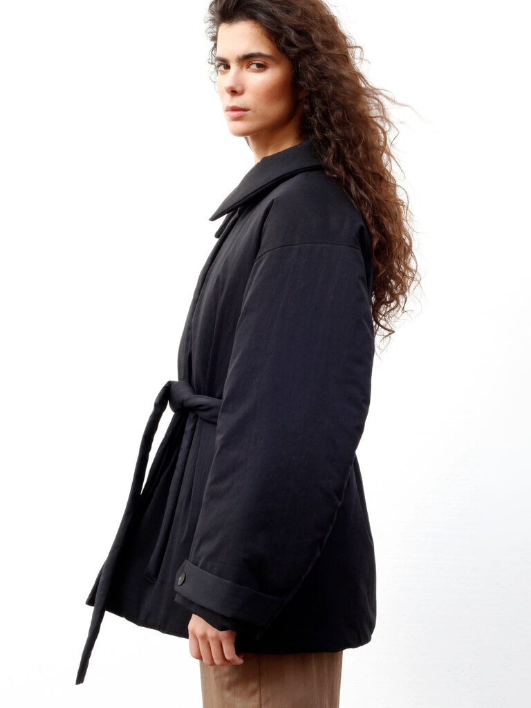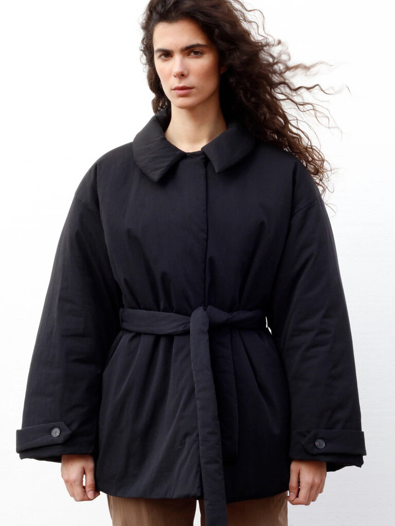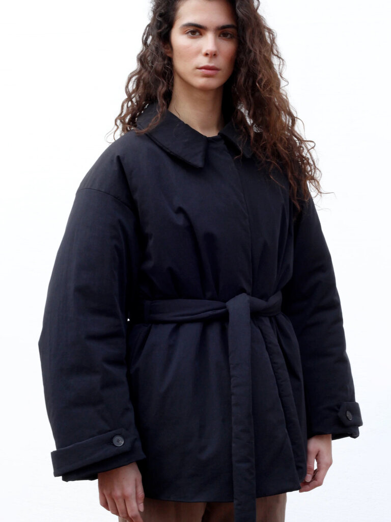 A cozy, oversized quilted jacket designed for winter. Featuring a soft, padded construction and a clean, minimal silhouette, the jacket comes with a belt to cinch the waist and adjust the fit, but it also includes hidden buttons for closure.