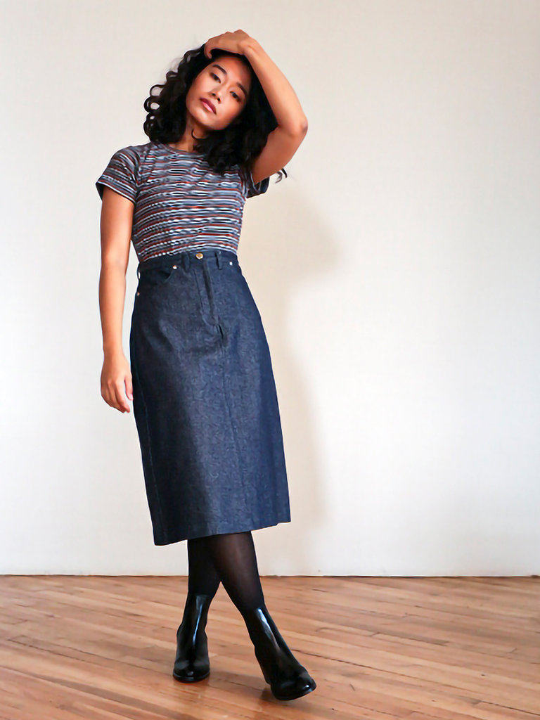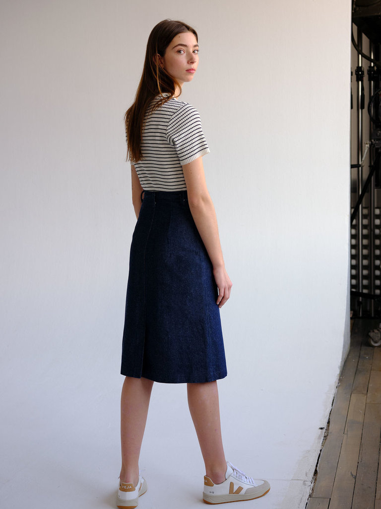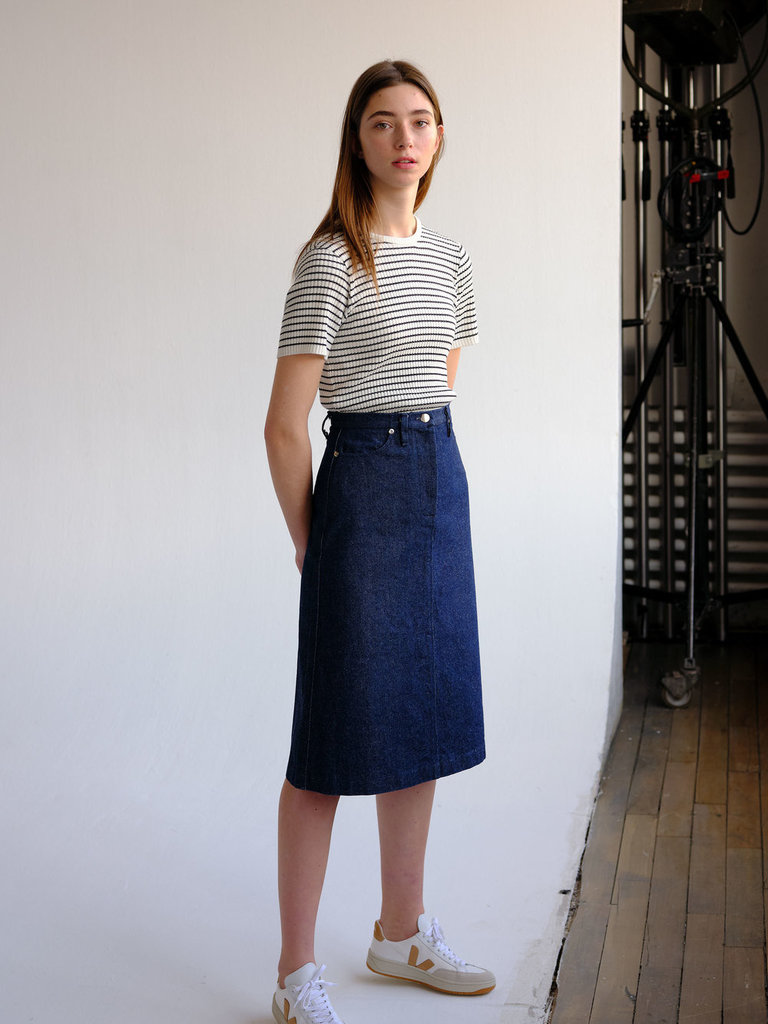 This denim skirt has a clean a-line shape that flares at the hem and falls mid-length. It has a structured and sleek look and is made with pre-shrunk unwashed denim.