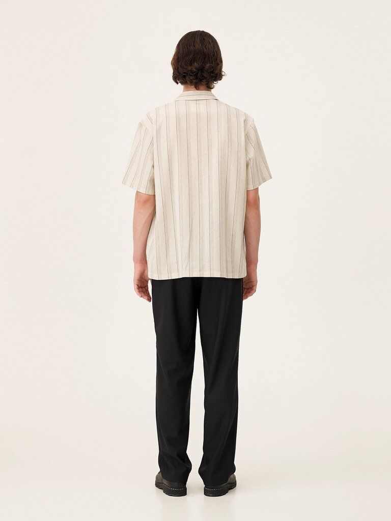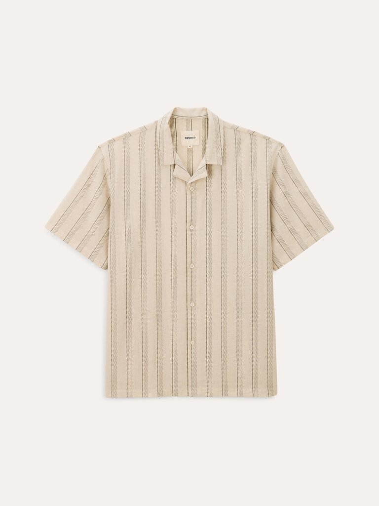 Shirt inspired by 1950s hawaiian style shirts. A breezy summer piece with a relaxed fit and open collar. Made from lightweight organic cotton and hemp with fine embroidered stripes. Features a button placket, casein buttons, and french seams.