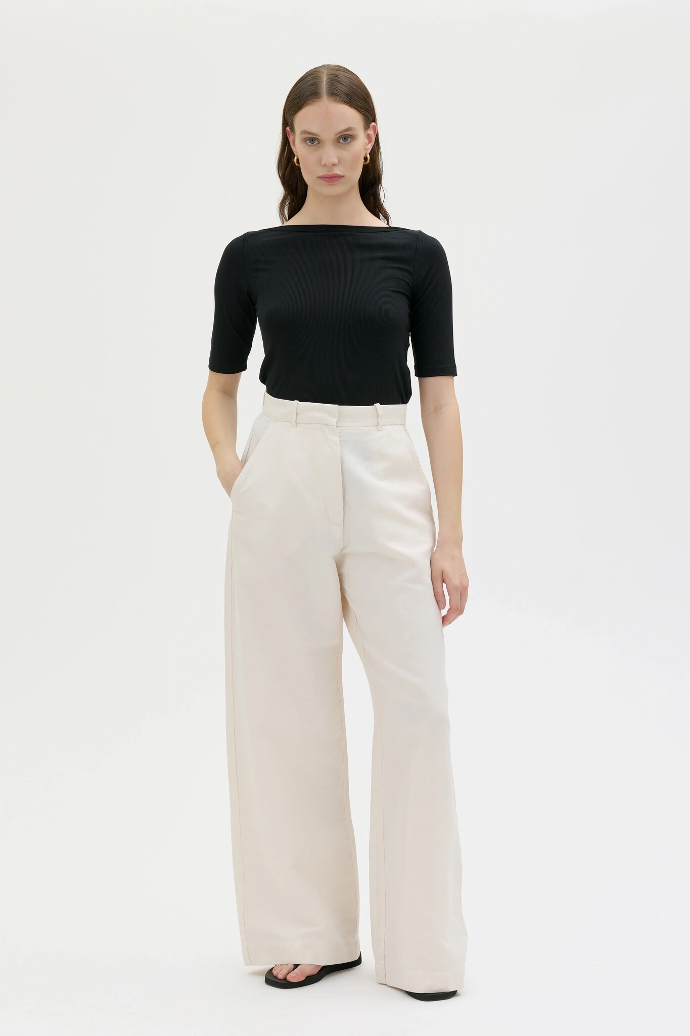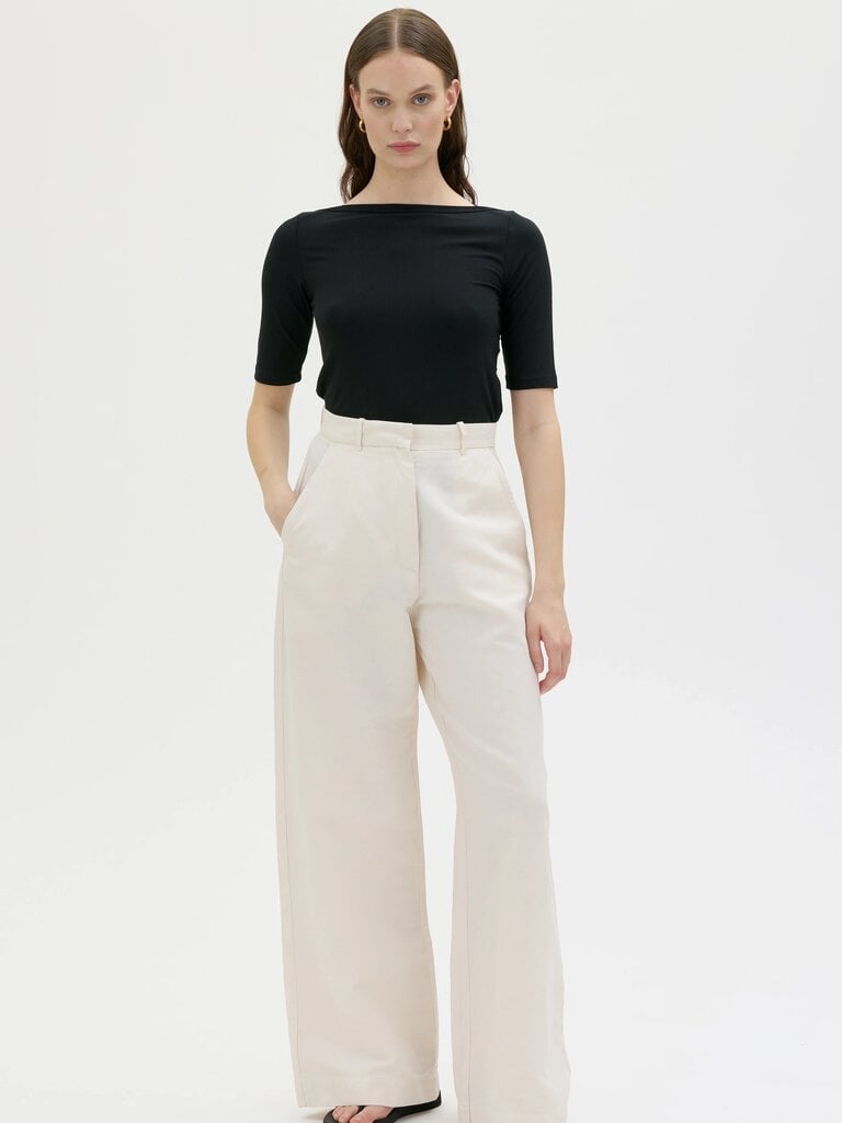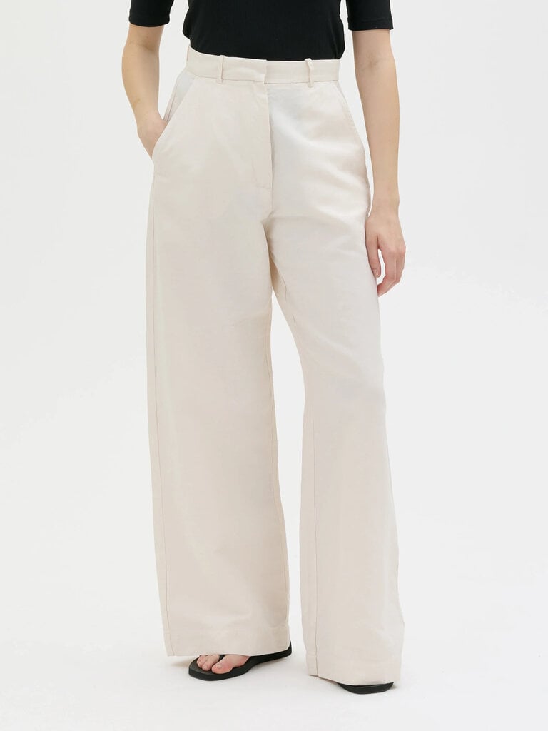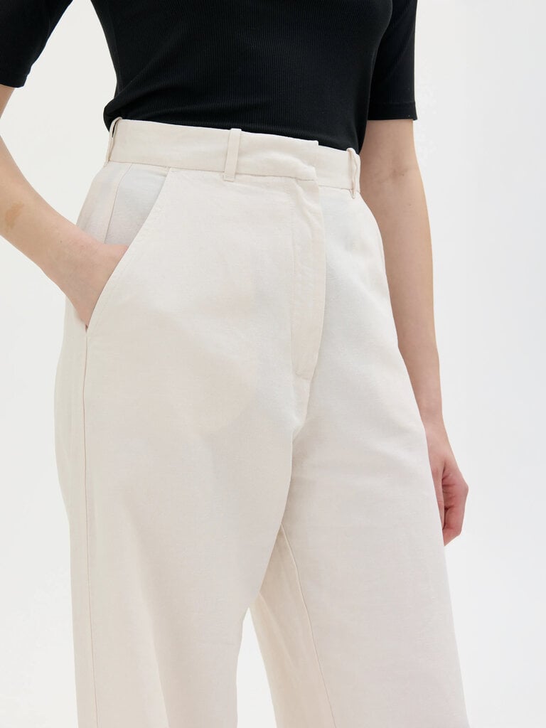 Hana is a pair of long, wide, slouchy tailored trousers crafted from a high-quality blend of organic cotton, linen, and lyocell. These trousers feature a zip fly, along with both side and back pockets.