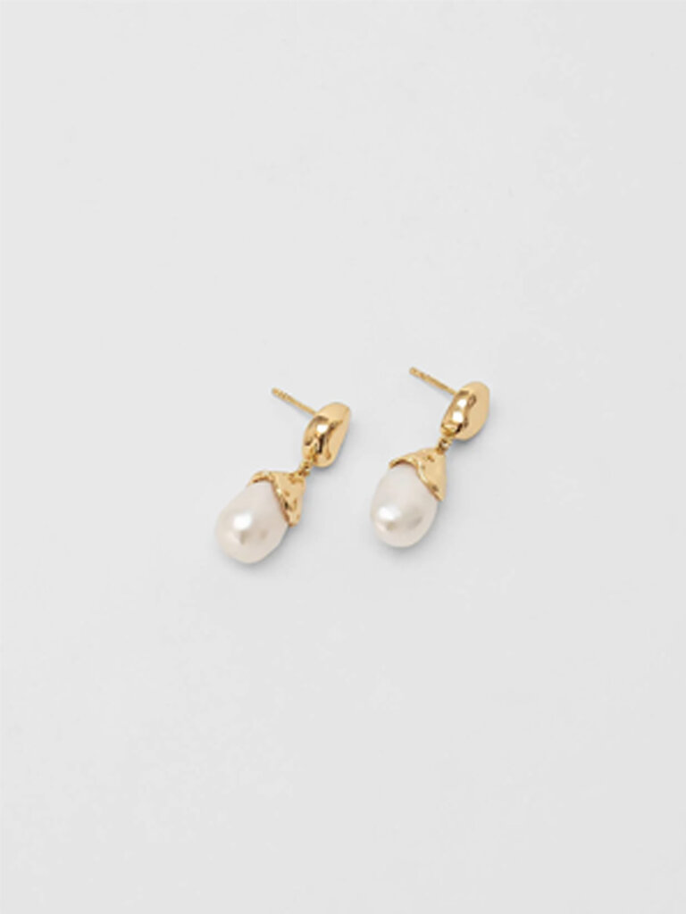 Dangle earrings with bean-shaped stud and freshwater pearls, made from hypoallergenic recycled brass plated with 14k gold.