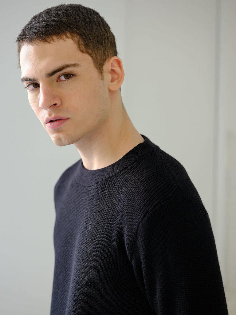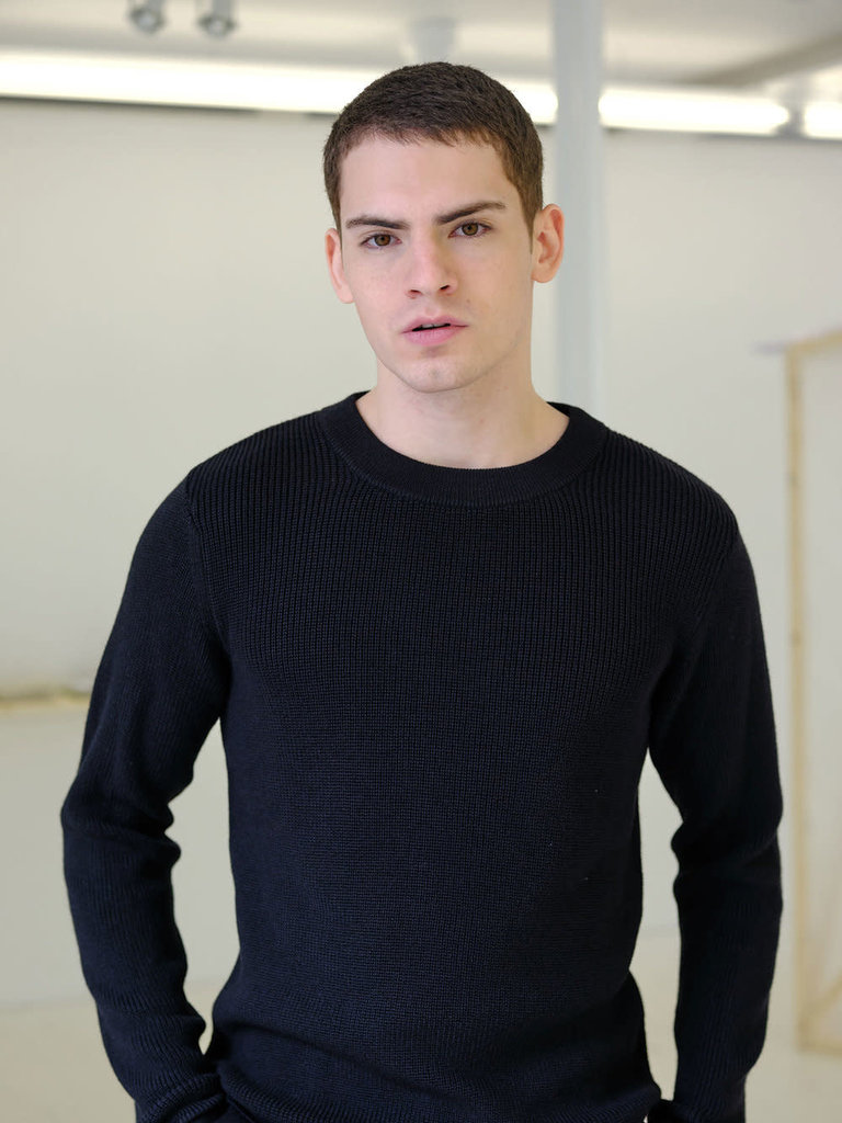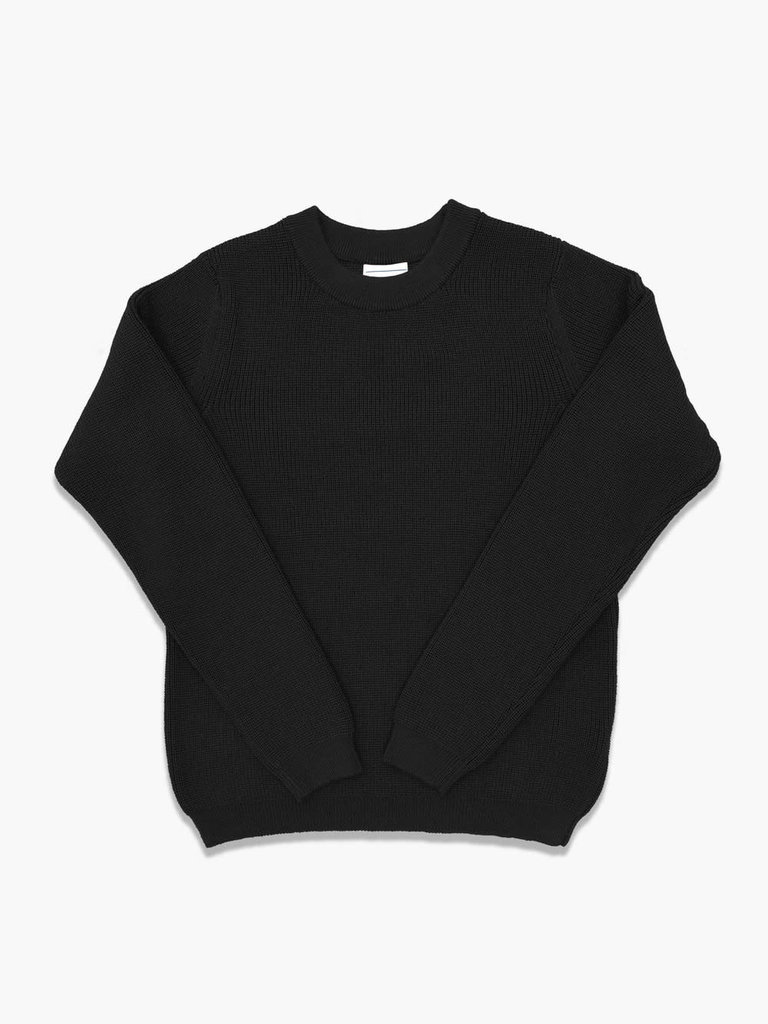 A knit sweater soft to the touch. Has a nice, slightly heavy feel that’ll keep your warm on chilly days. Ribbed at the wrists, hem and neckline.